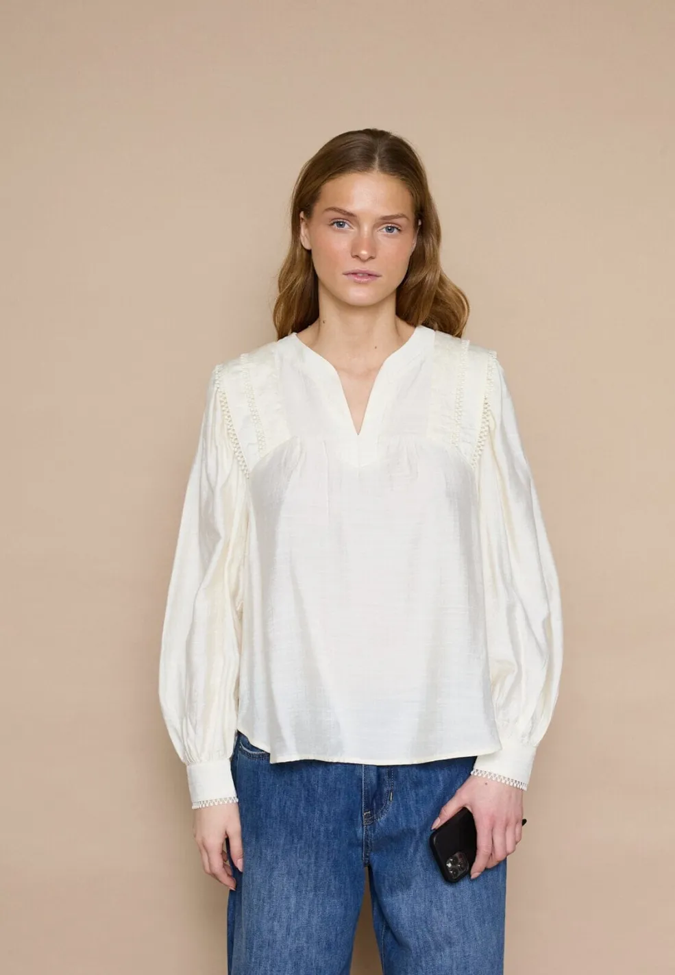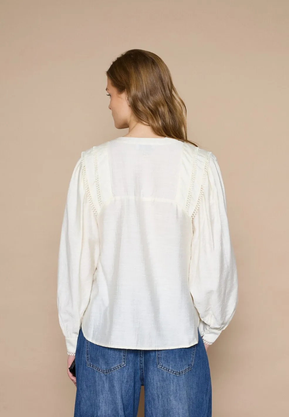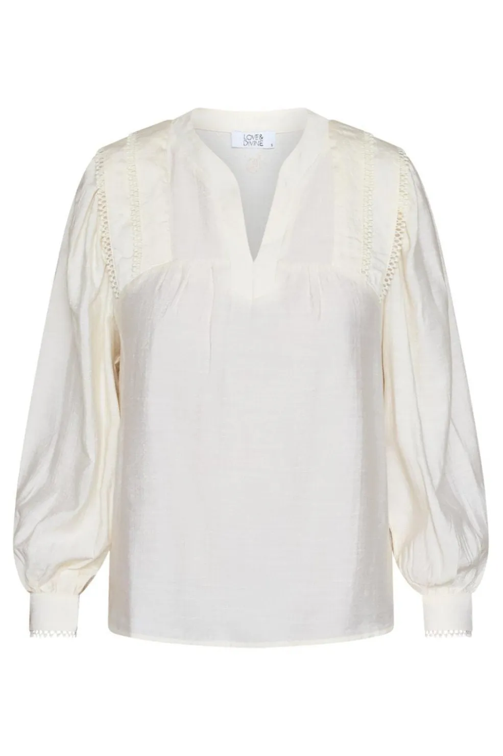 Cremefarvet bluse fra Love & Divine med løs pasform og lange ærmer. Blusen har en V-hals og dekorative flæsedetaljer på skuldrene og manchetterne.
