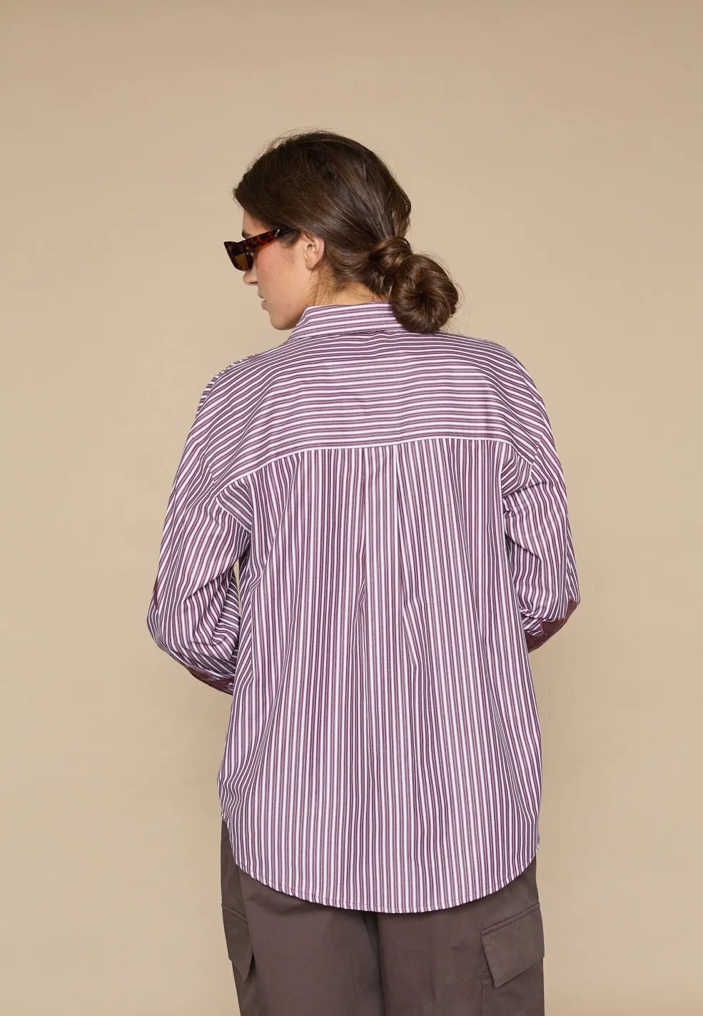 Stribet skjorte fra Love & Divine med store blomsterapplikationer i bordeaux. Skjorten har klassisk krave og knaplukning.