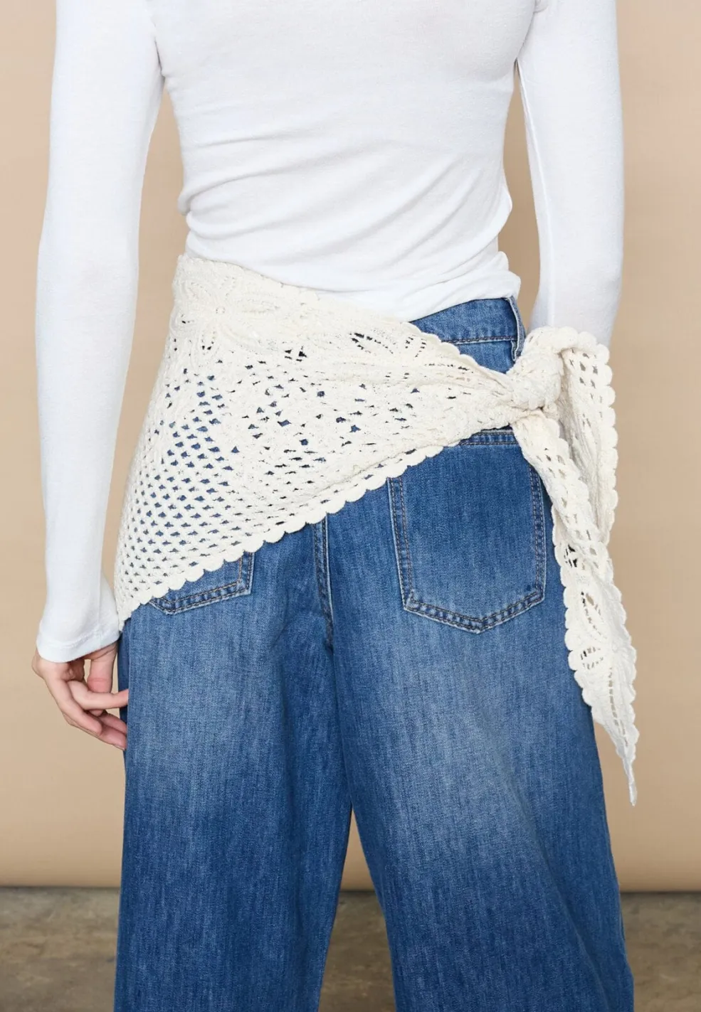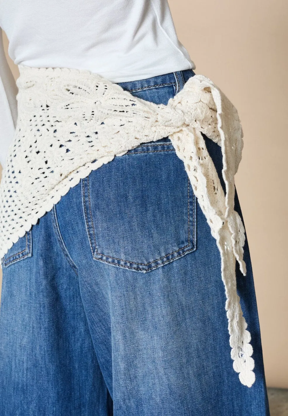 Cremefarvet hæklet tørklæde fra Love & Divine, lavet af 100 % bomuld. Tørklædet har et trekantet design med hæklede blomsterdetaljer og en bølget kant.