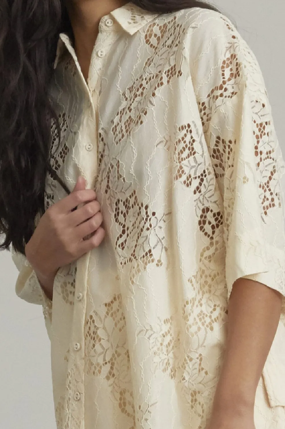 Porcelænsfarvet skjorte fra Love & Divine med blonder og burnout-mønster. Skjorten har lange ærmer og en klassisk skjortekrave med knaplukning.