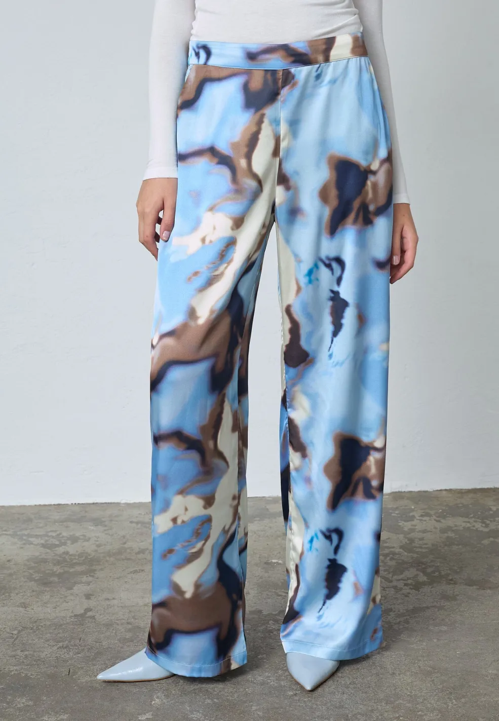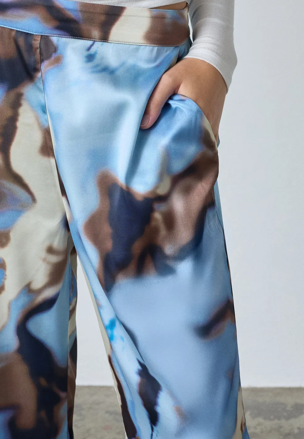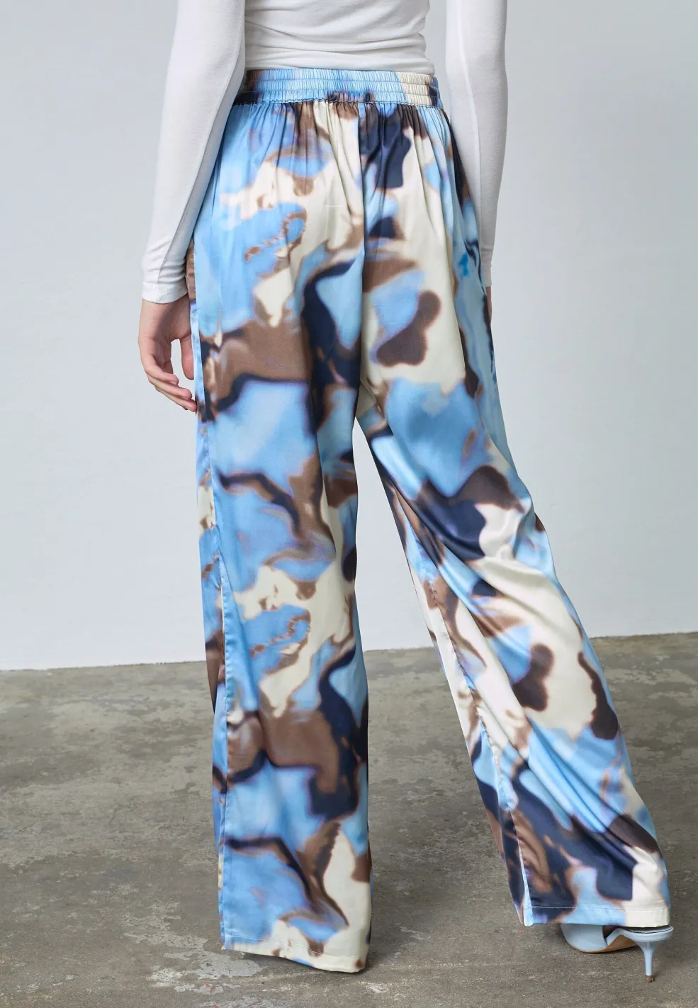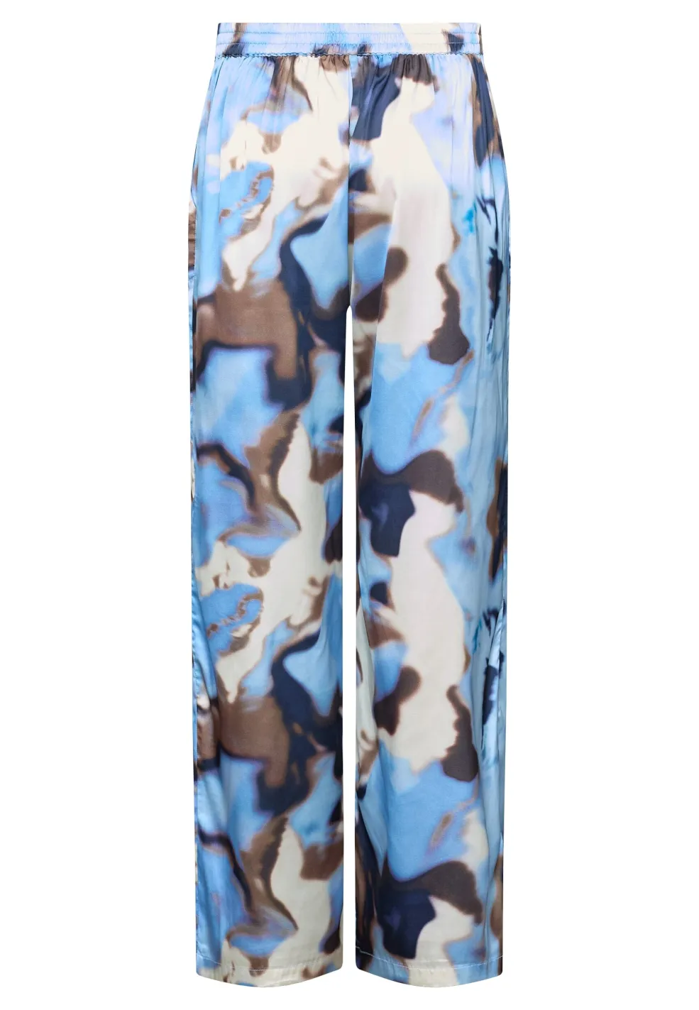 Bukser fra Love & Divine i 100% polyester med et blåt vandprintmønster. Bukserne har et bredt ben-design og en løs pasform.