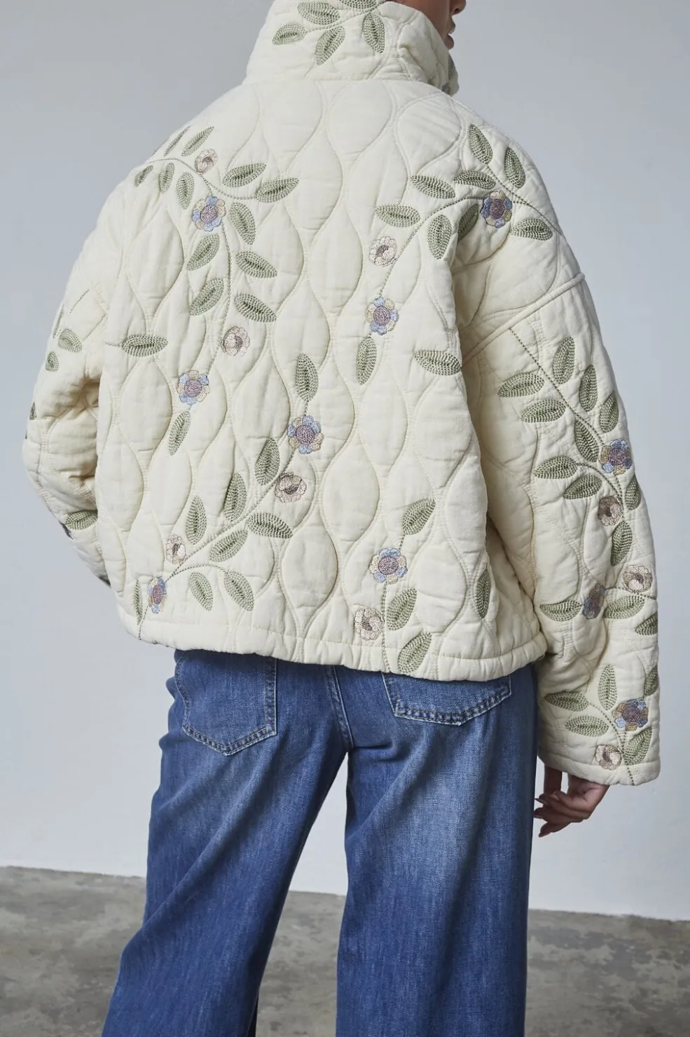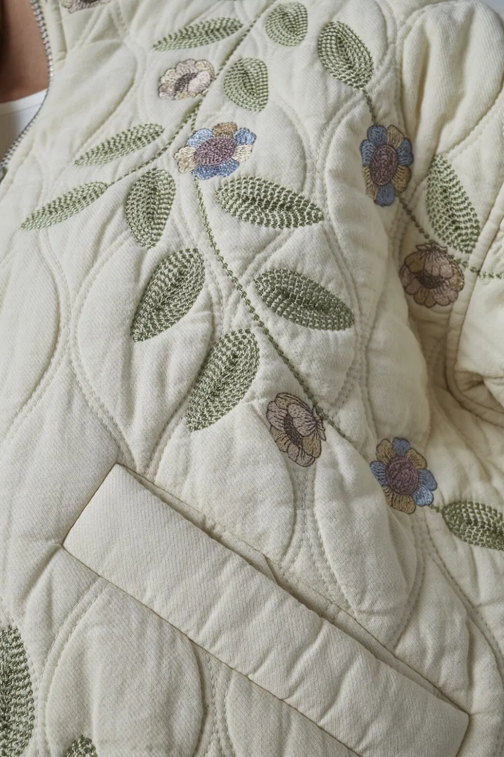 Quiltet jakke fra Love & Divine med broderede blomster på en cremefarvet bund. Jakken har høj krave, lynlåslukning foran og praktiske sidelommer.