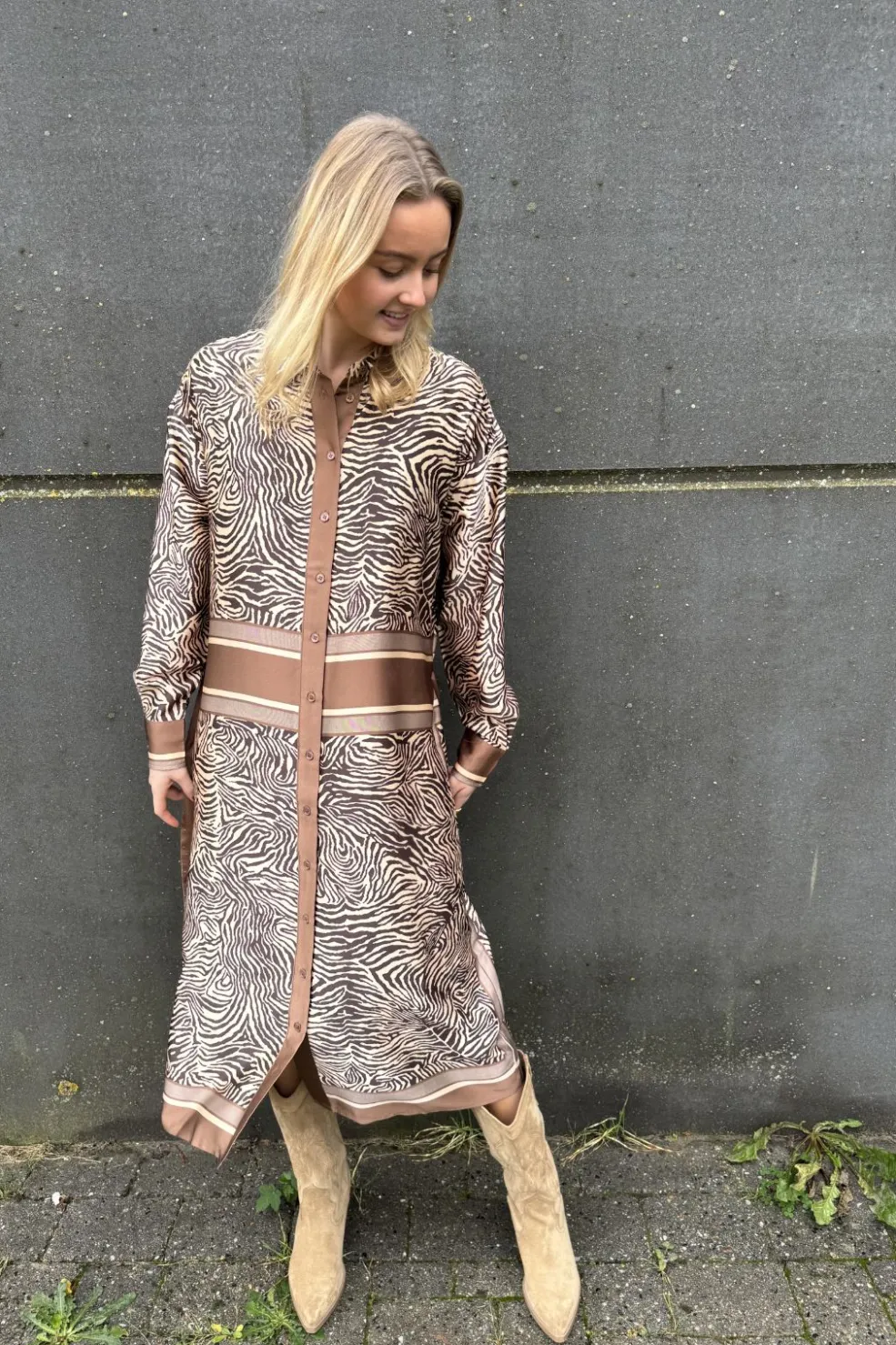 Kjole fra Love & Divine med brun zebra-print. Kjolen har skjortekrave, lange ærmer og bindebåndsdetaljer ved taljen.