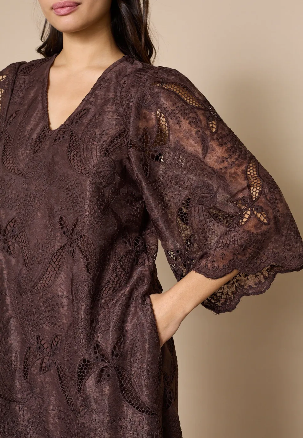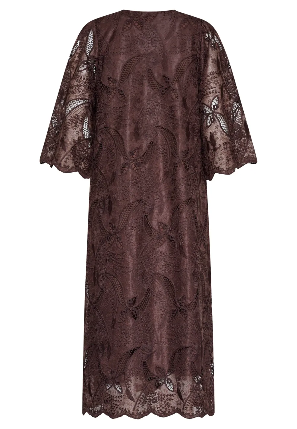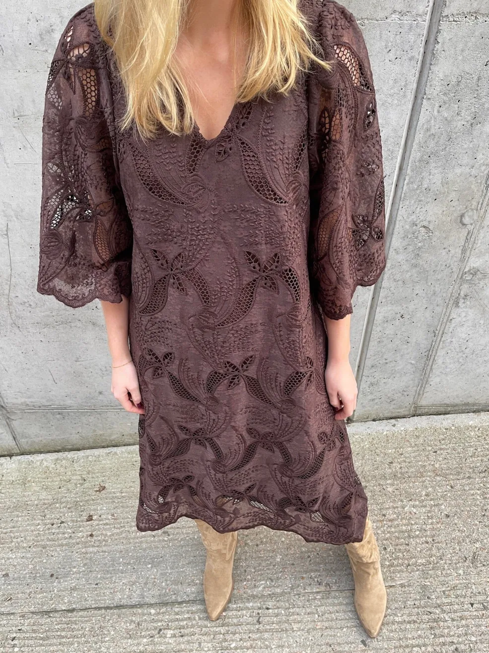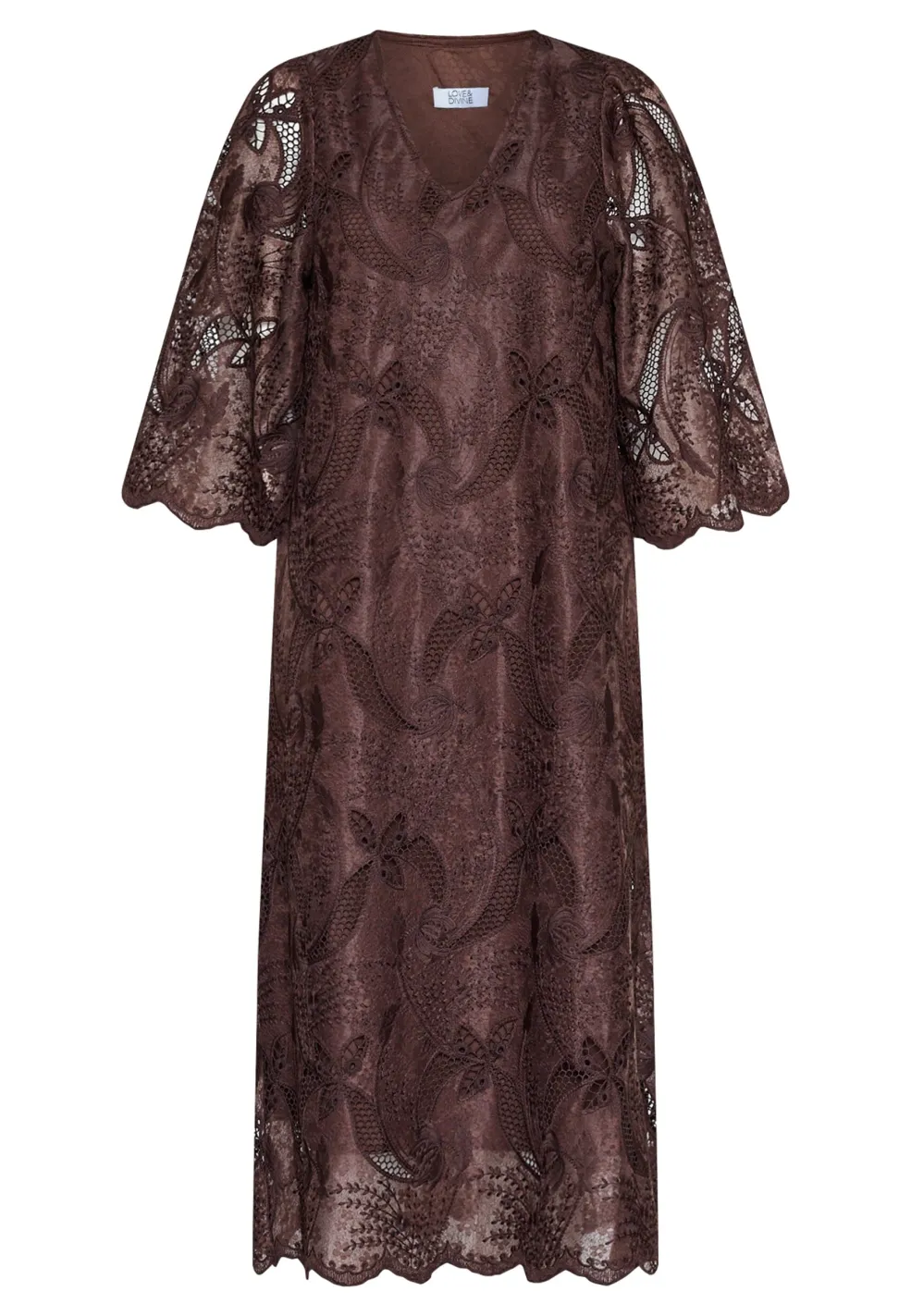 Brun kjole fra Love & Divine med broderi og blonde. Kjolen har trekvartlange ærmer, V-udskæring og et blomster- og paisleymønster.
