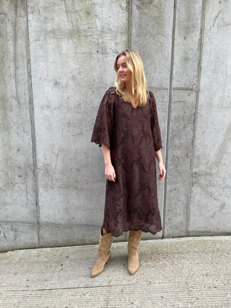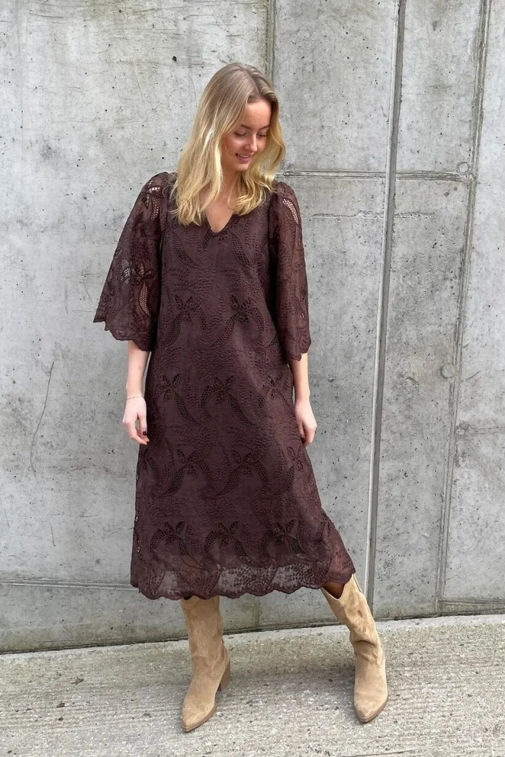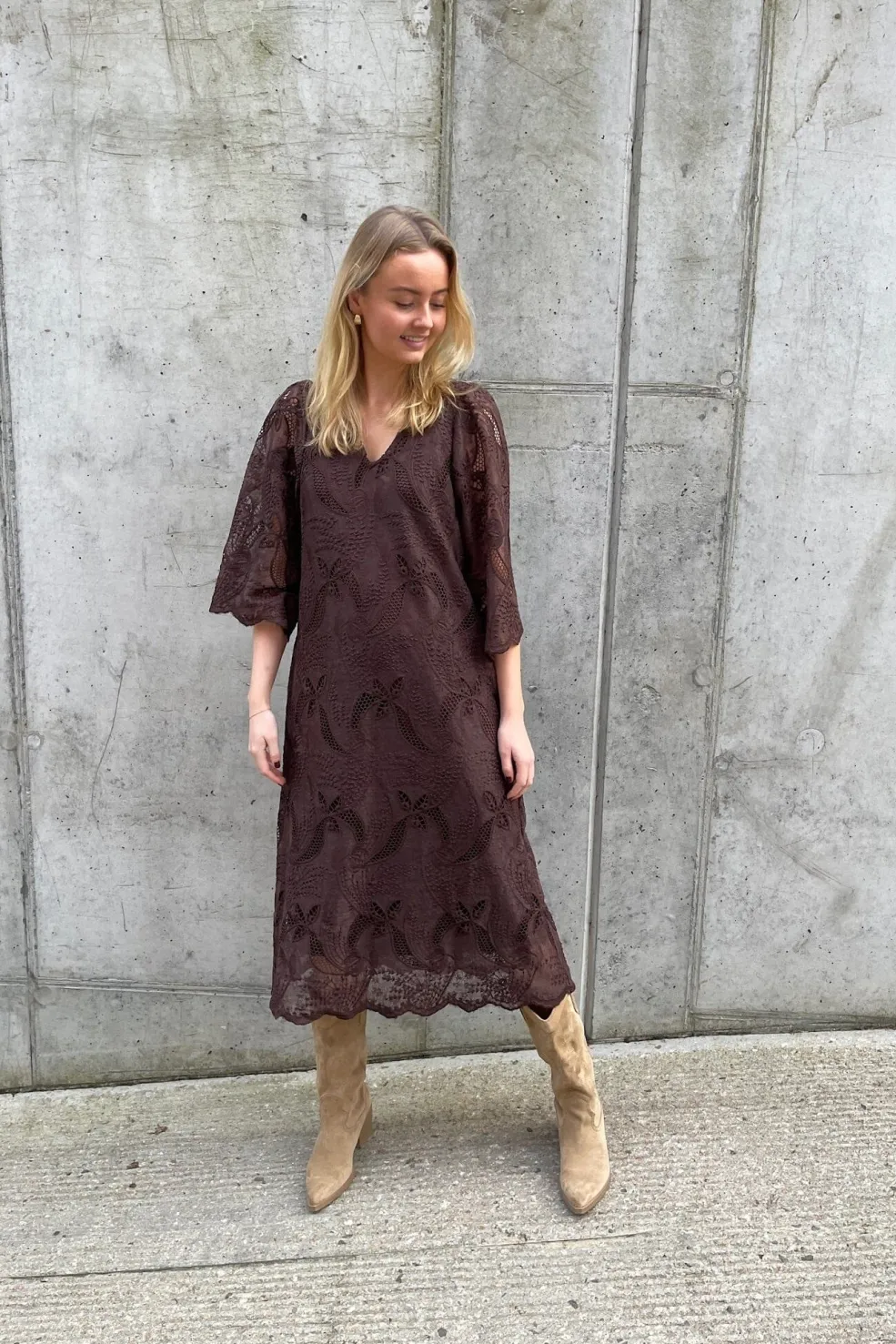 Brun kjole fra Love & Divine med broderi og blonde. Kjolen har trekvartlange ærmer, V-udskæring og et blomster- og paisleymønster.