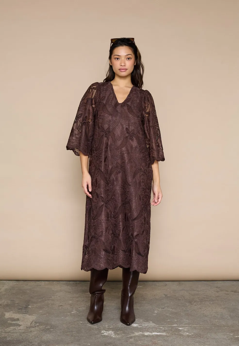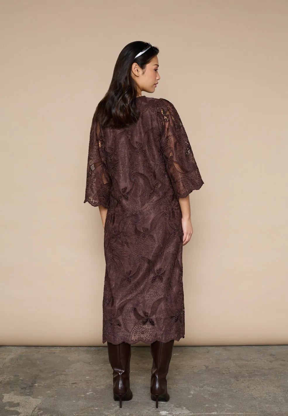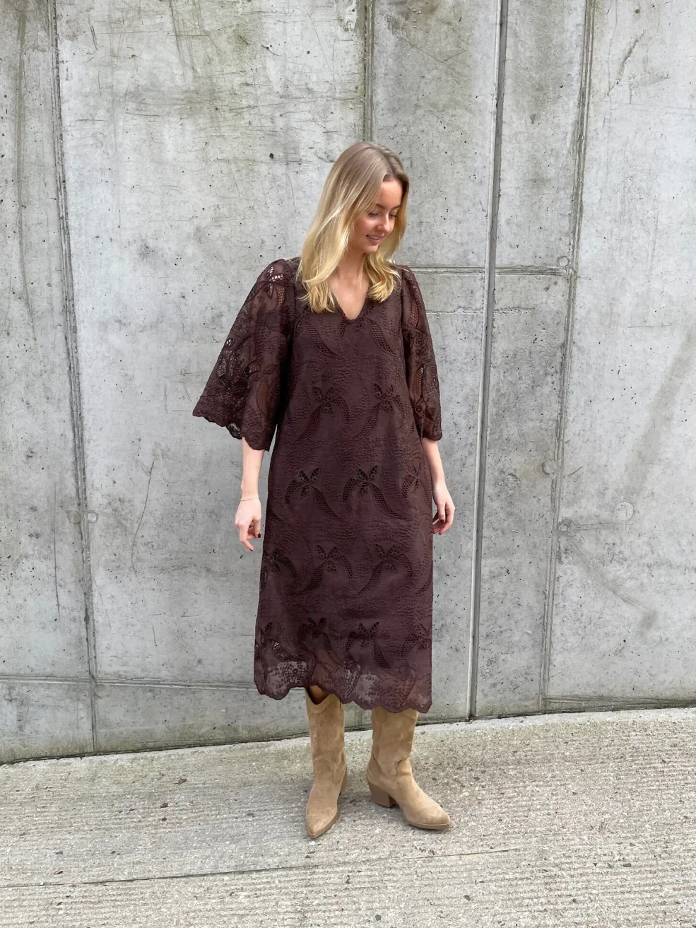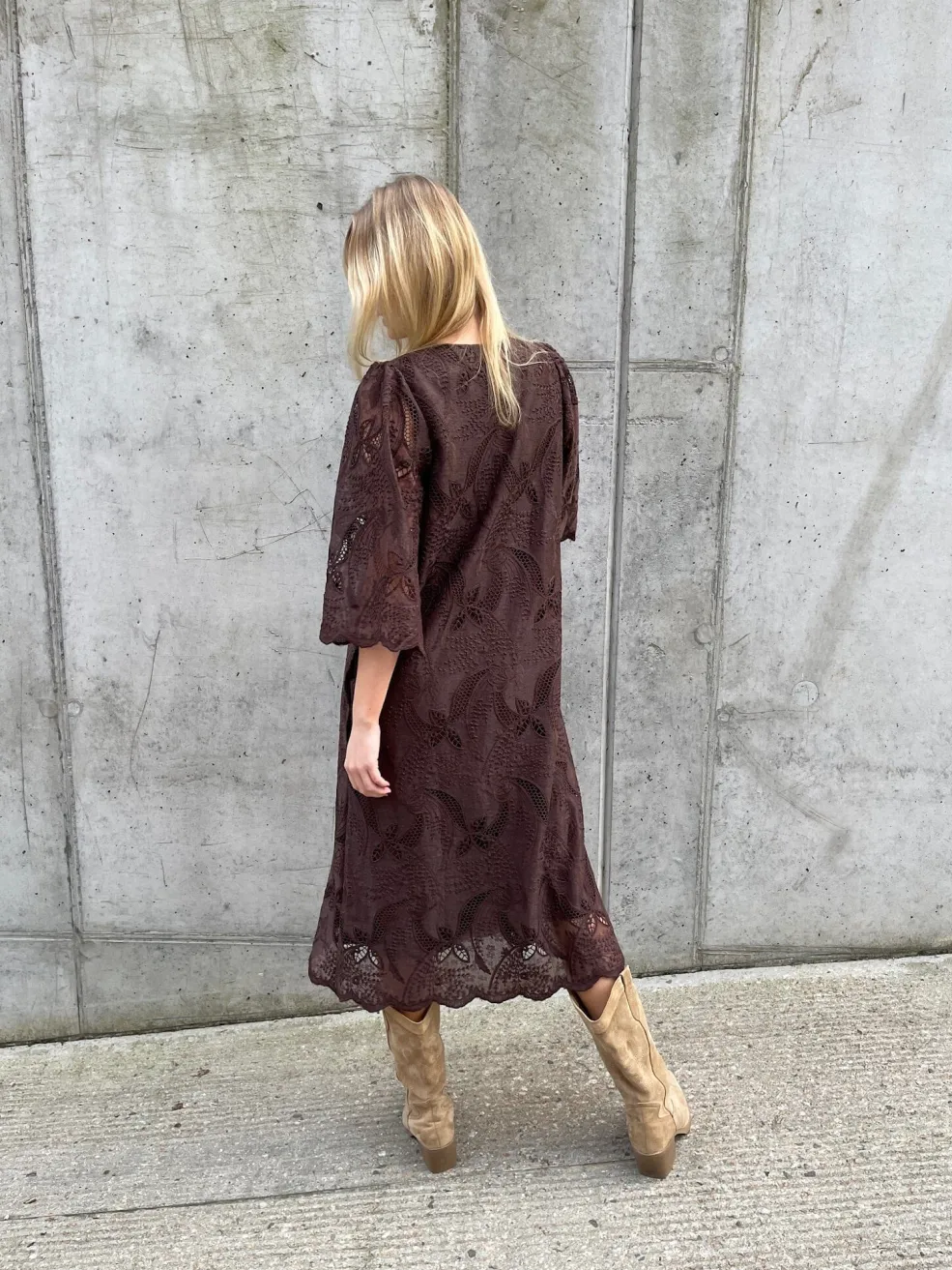 Brun kjole fra Love & Divine med broderi og blonde. Kjolen har trekvartlange ærmer, V-udskæring og et blomster- og paisleymønster.