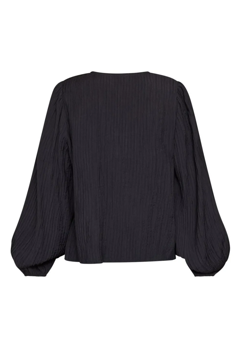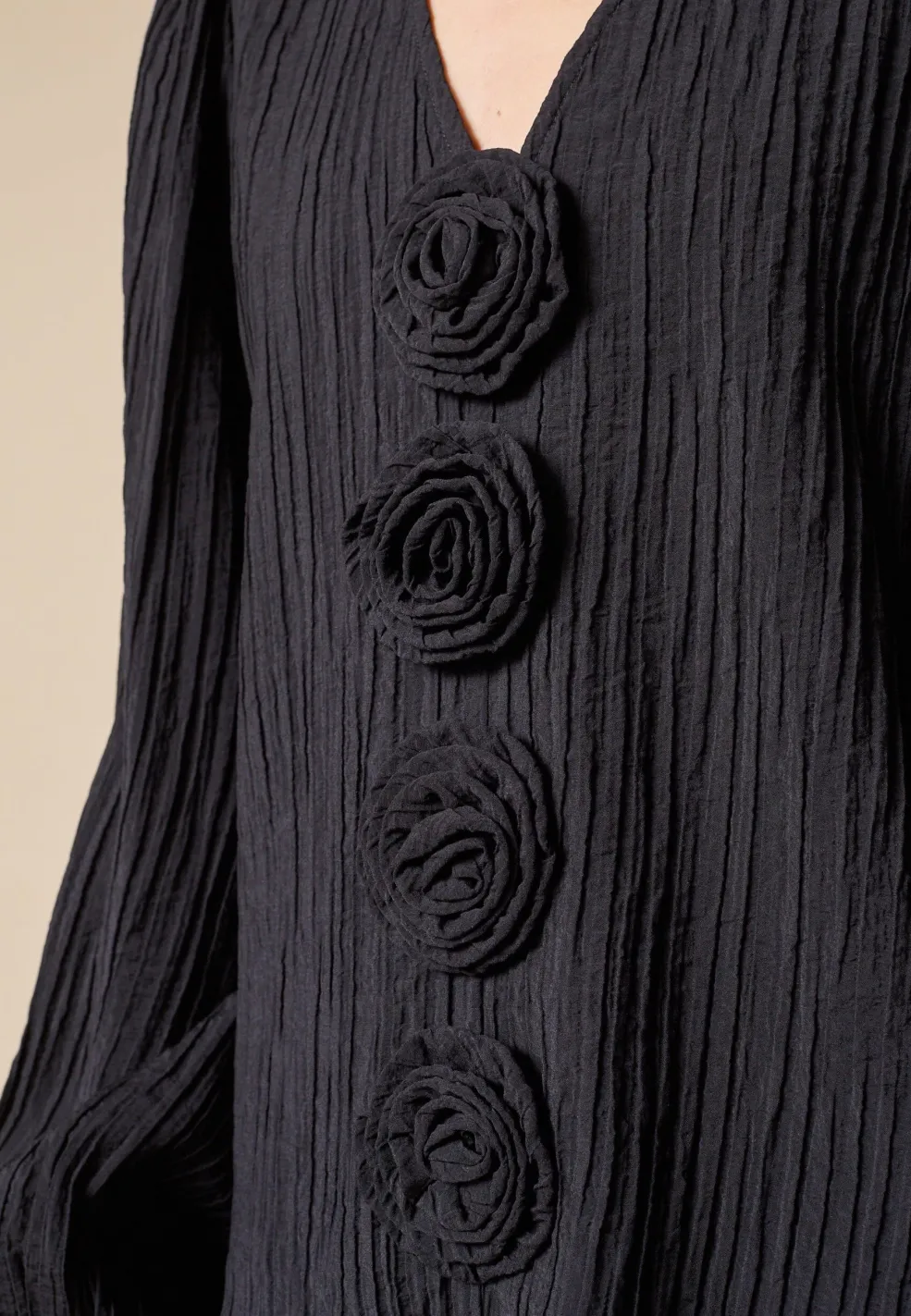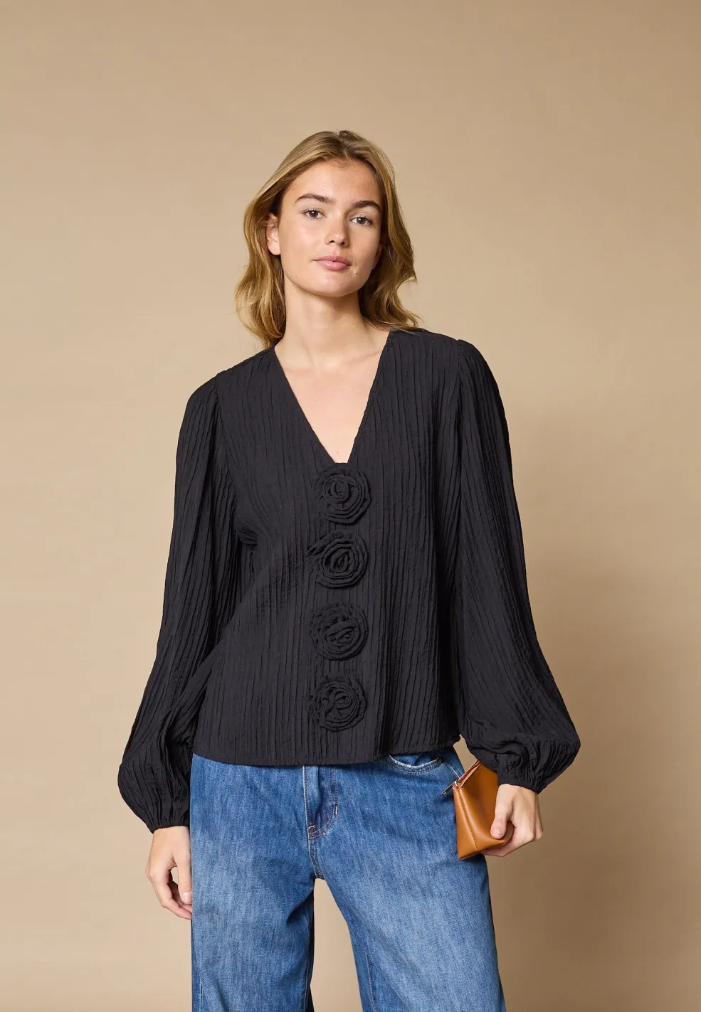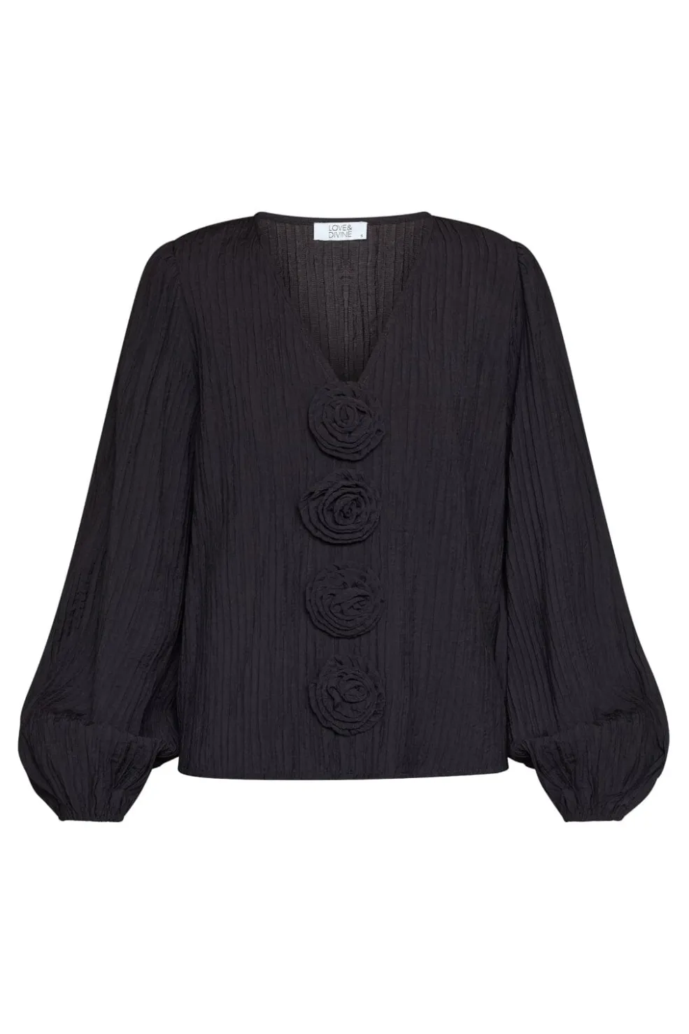 Sort bluse fra Love & Divine med fire dekorative blomsterlignende detaljer foran, lange ærmer med let puffede manchetter og en V-udskæring.