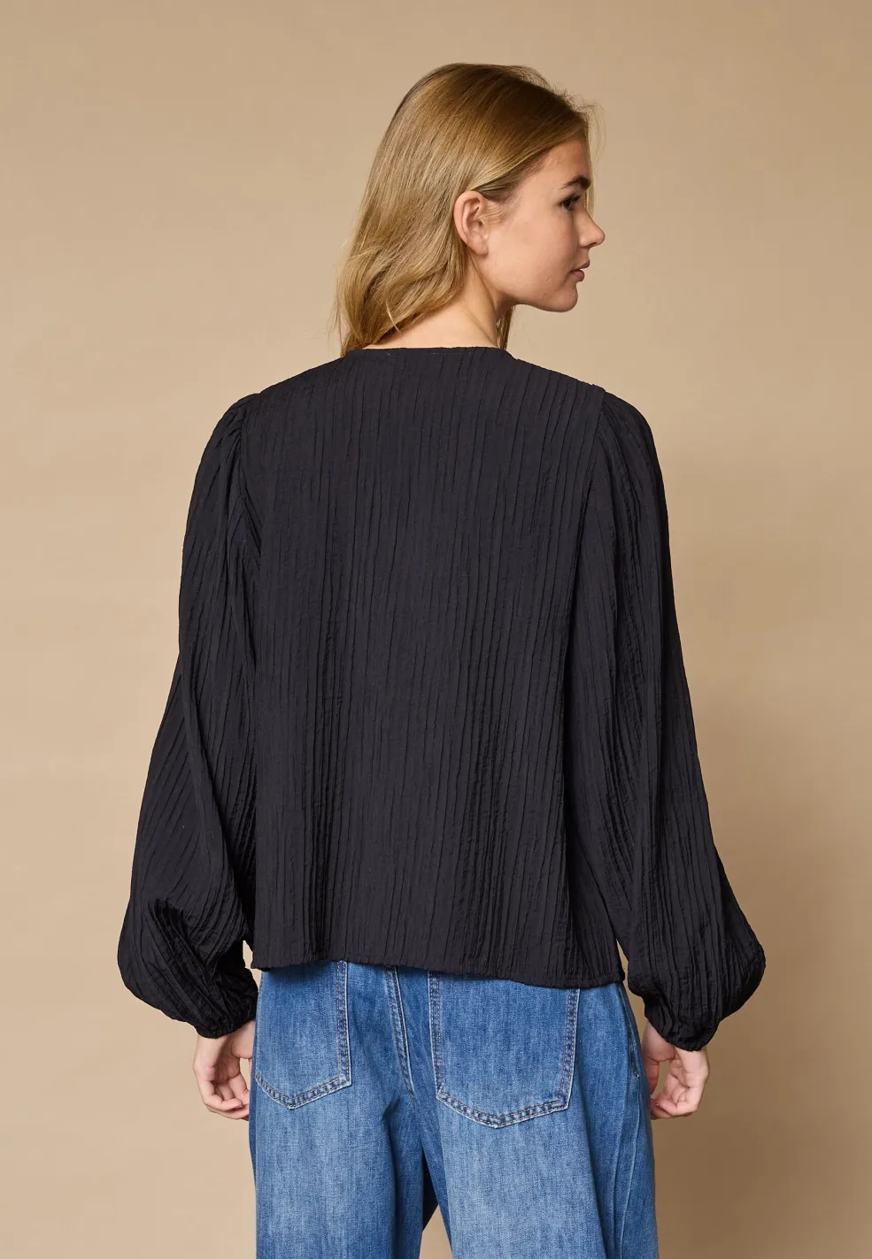- Lange ærmer med puffede manchetter
