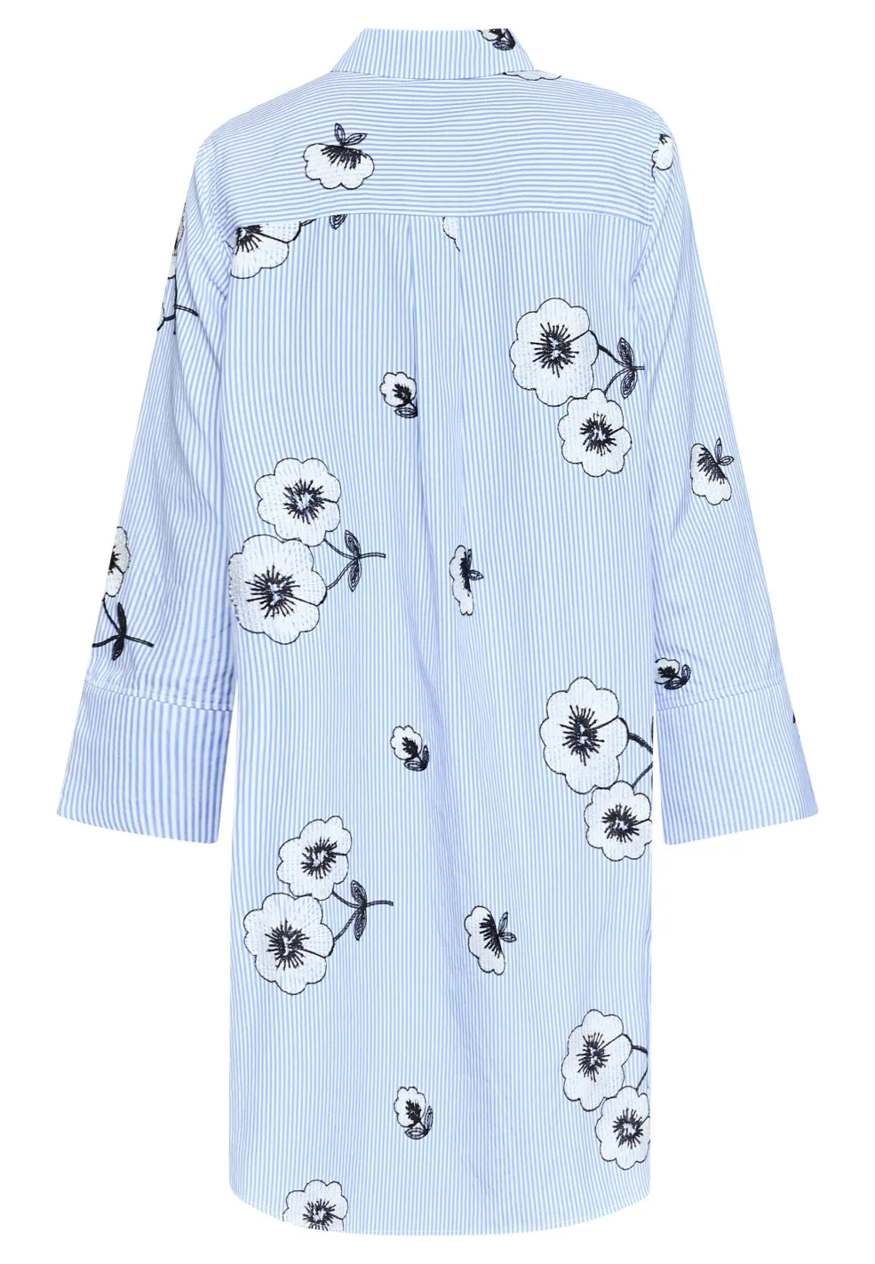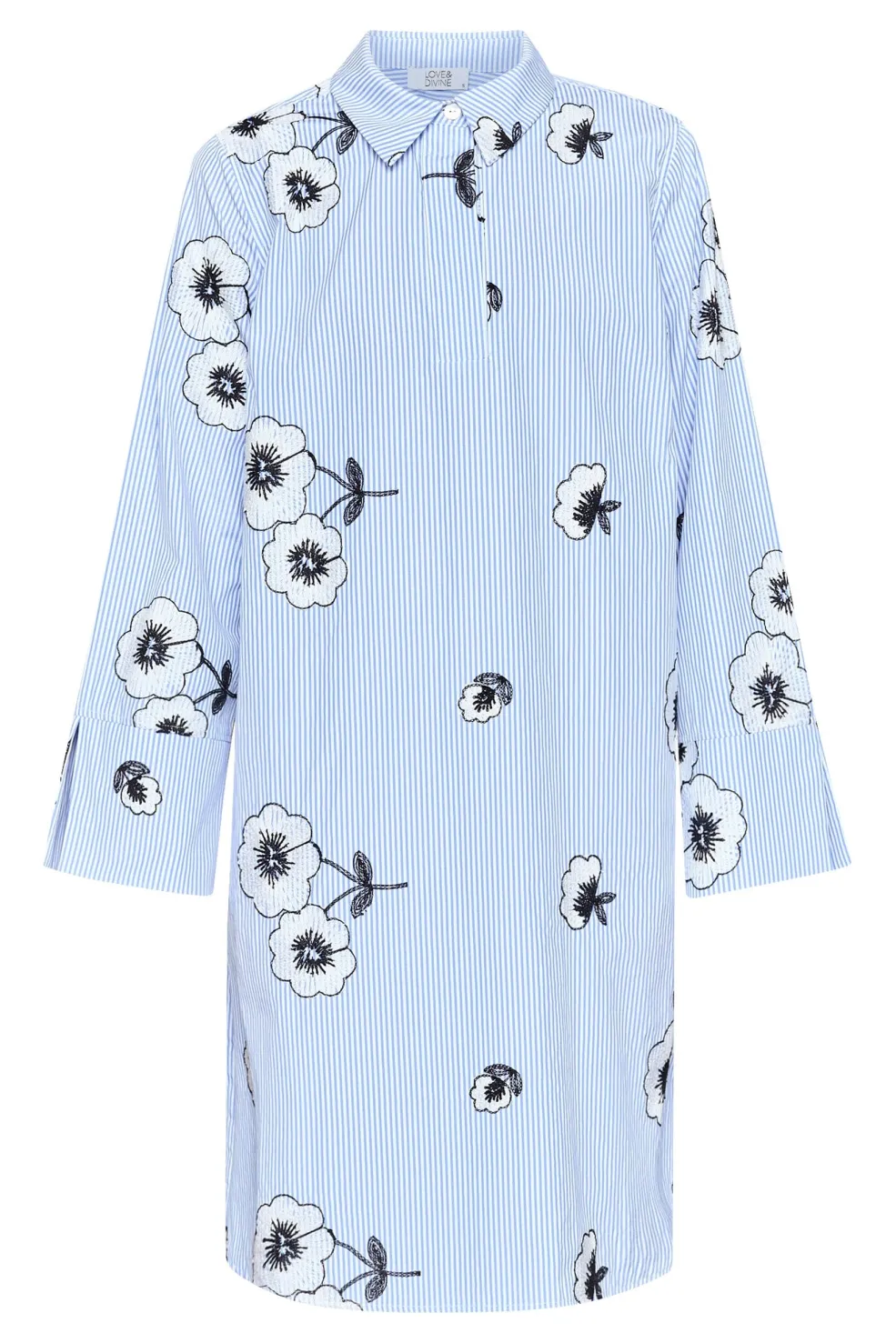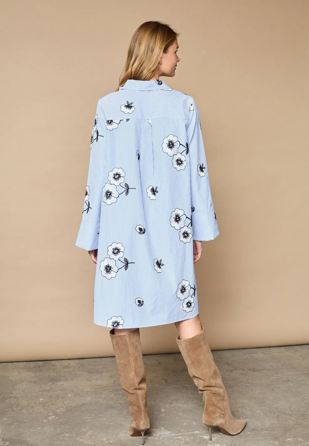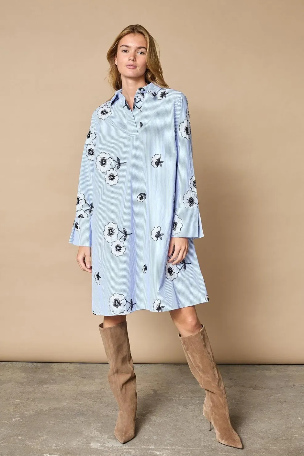 Kjole fra Love & Divine i lyseblå og hvid med striber og blomsterprint. Kjolen har broderi som detalje og en løs pasform.