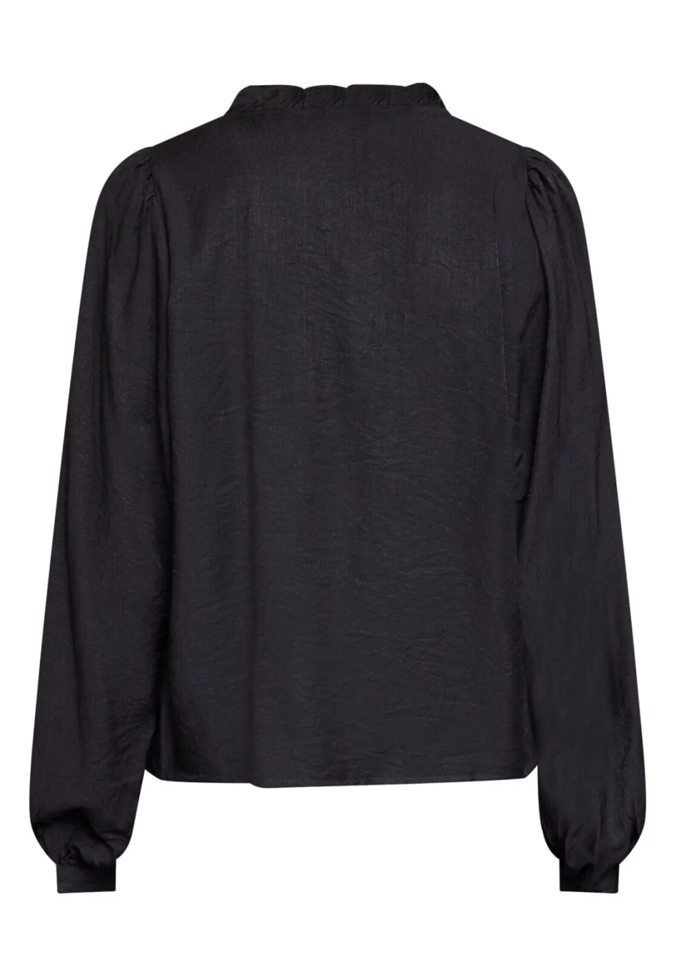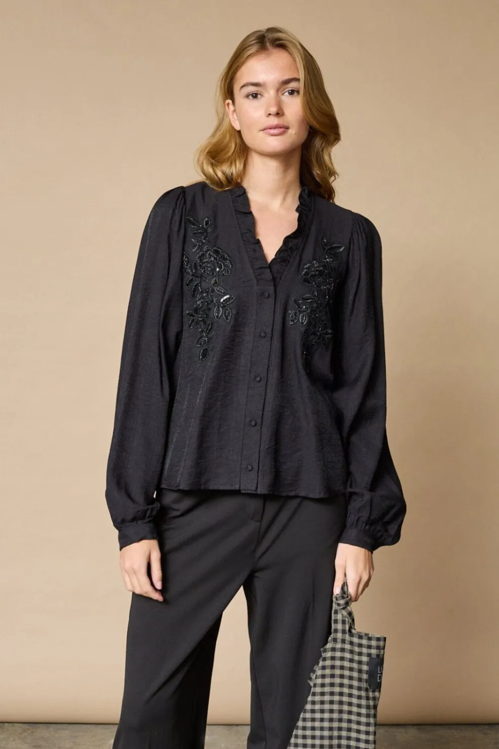 Sort skjorte fra Love & Divine med blomstret broderi, pailletter og flæser på forsiden. Den har en rynket krave ved V-halsen og lange ærmer med manchetter.
