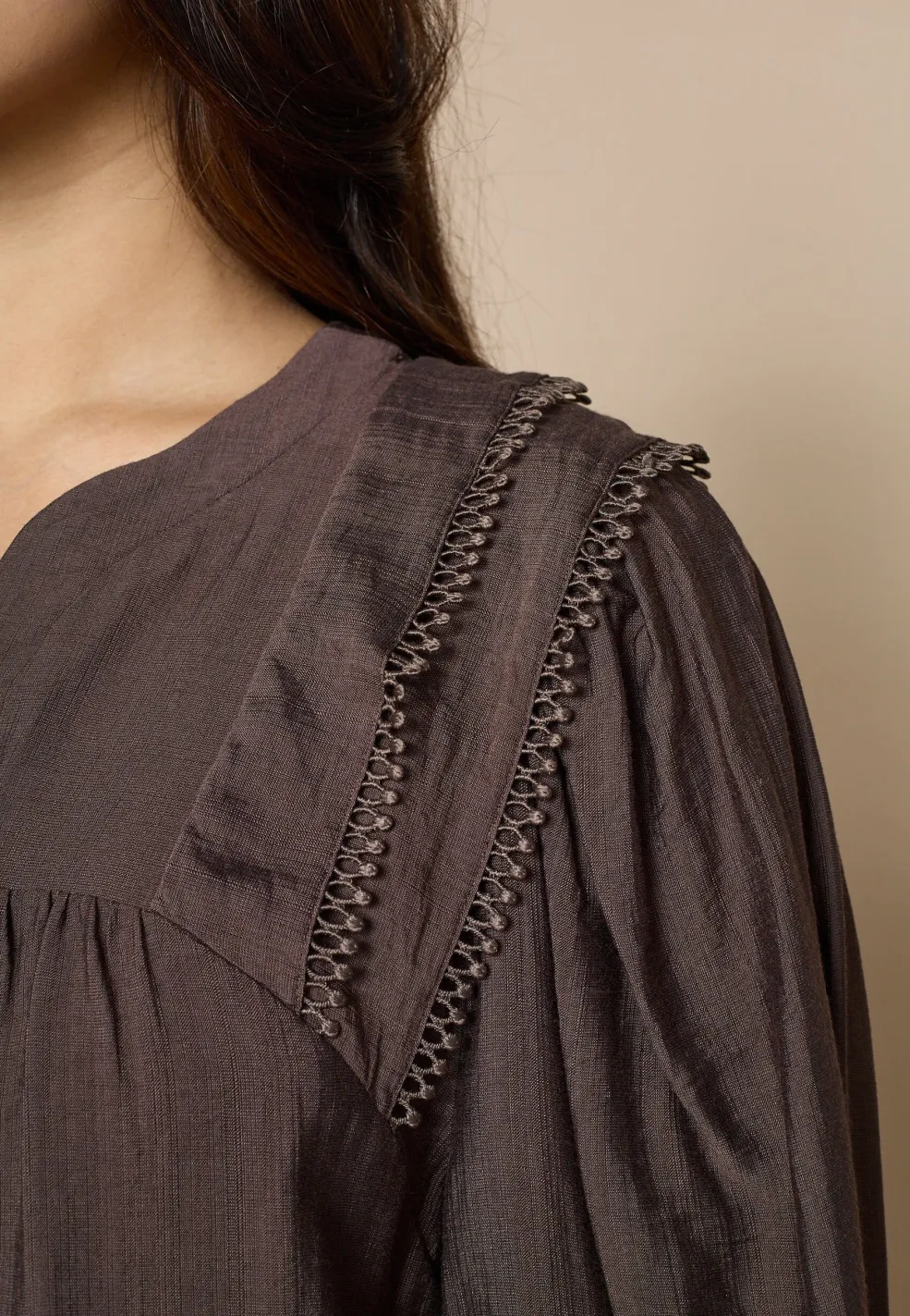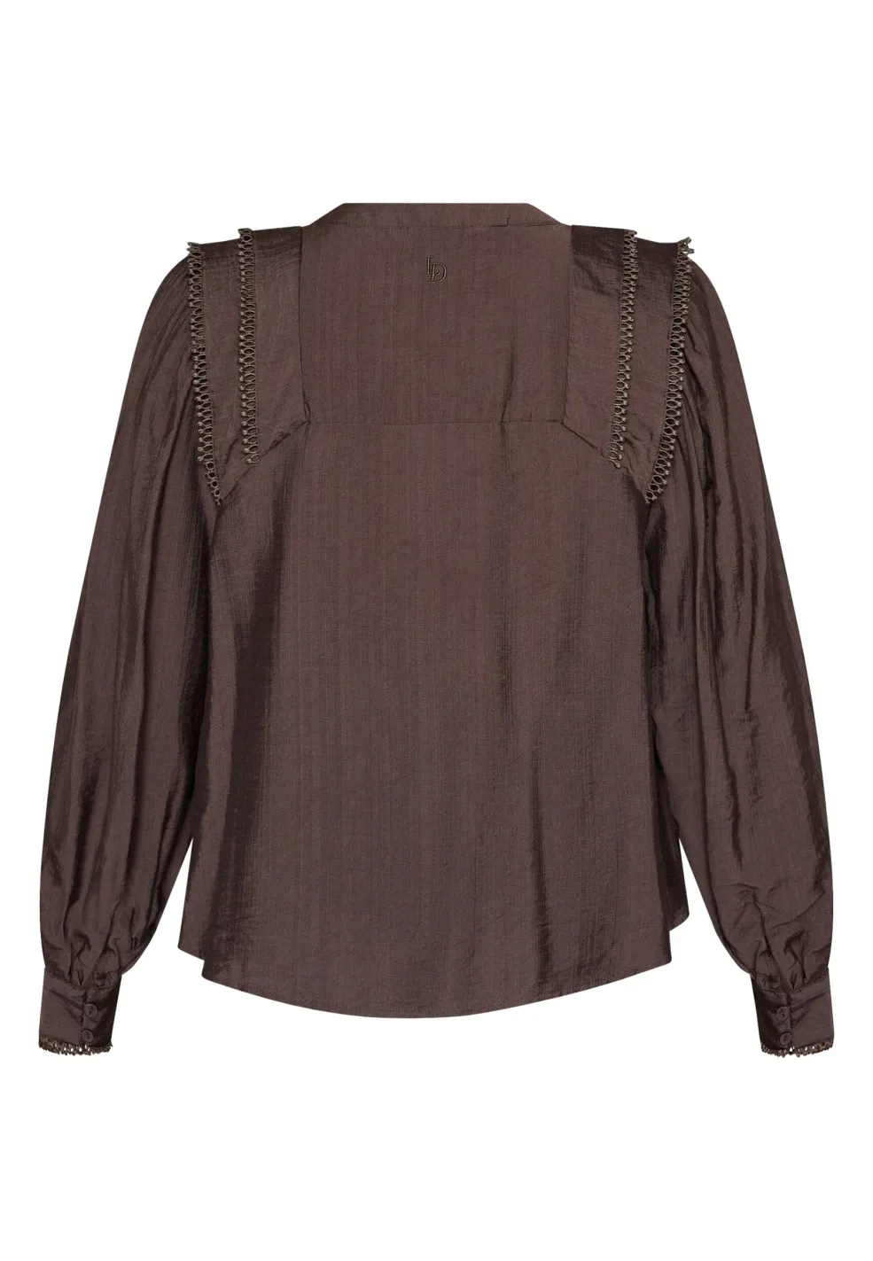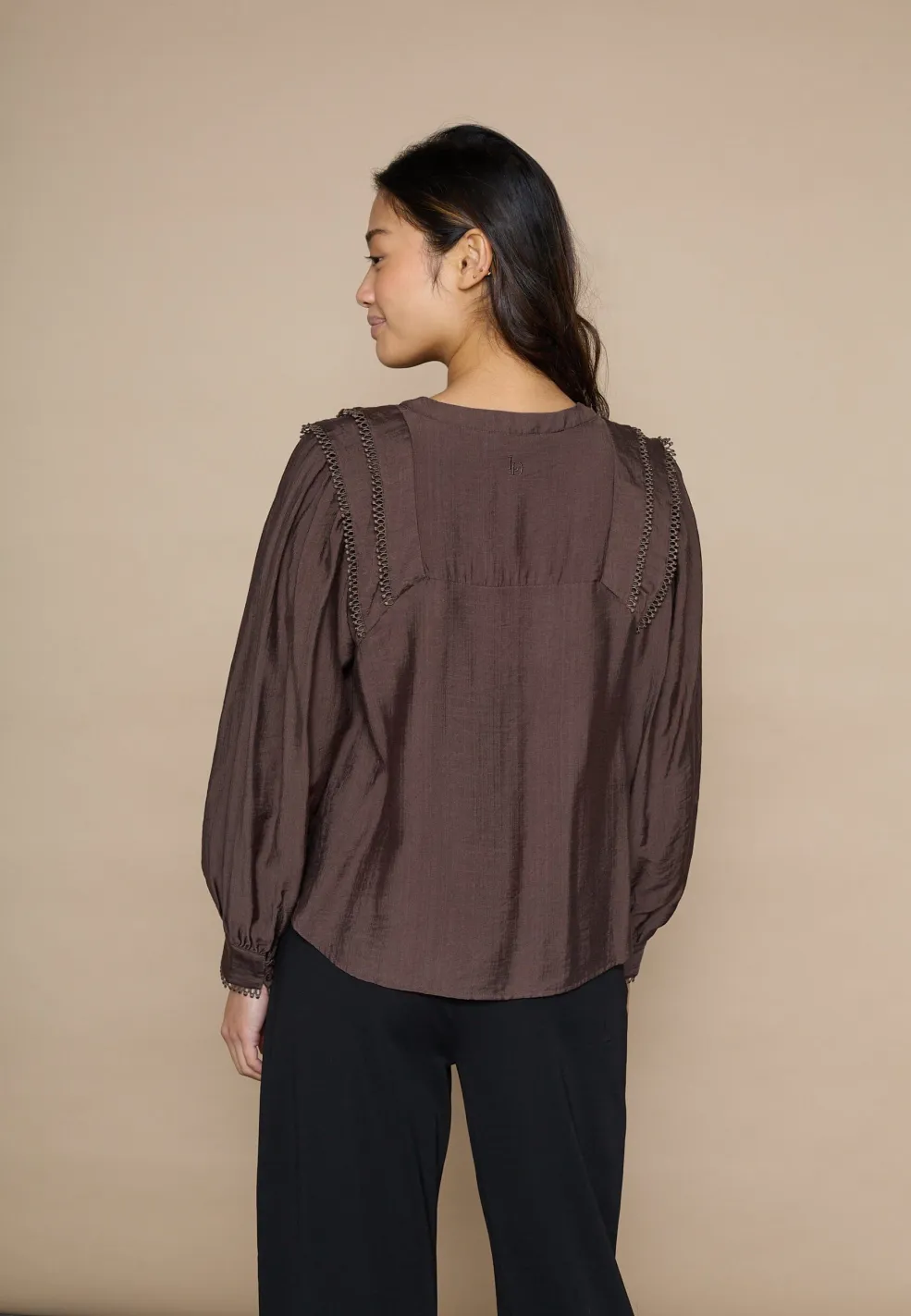 Mørkebrun bluse fra Love & Divine, lavet af en blanding af viscose og polyamid. Blusen har en V-hals og lange ærmer.