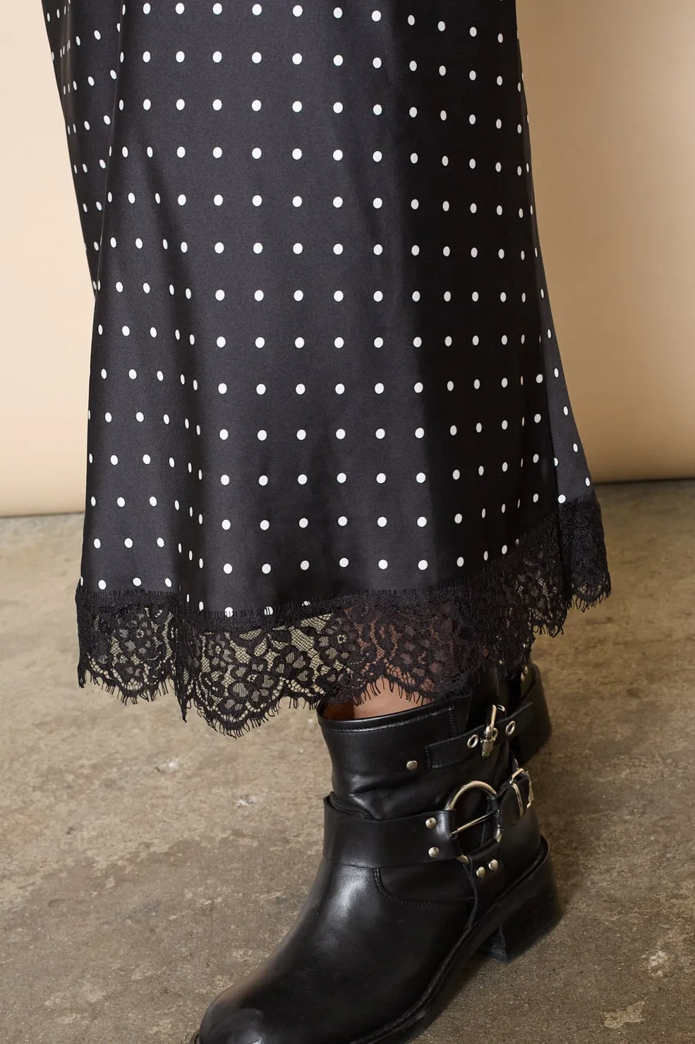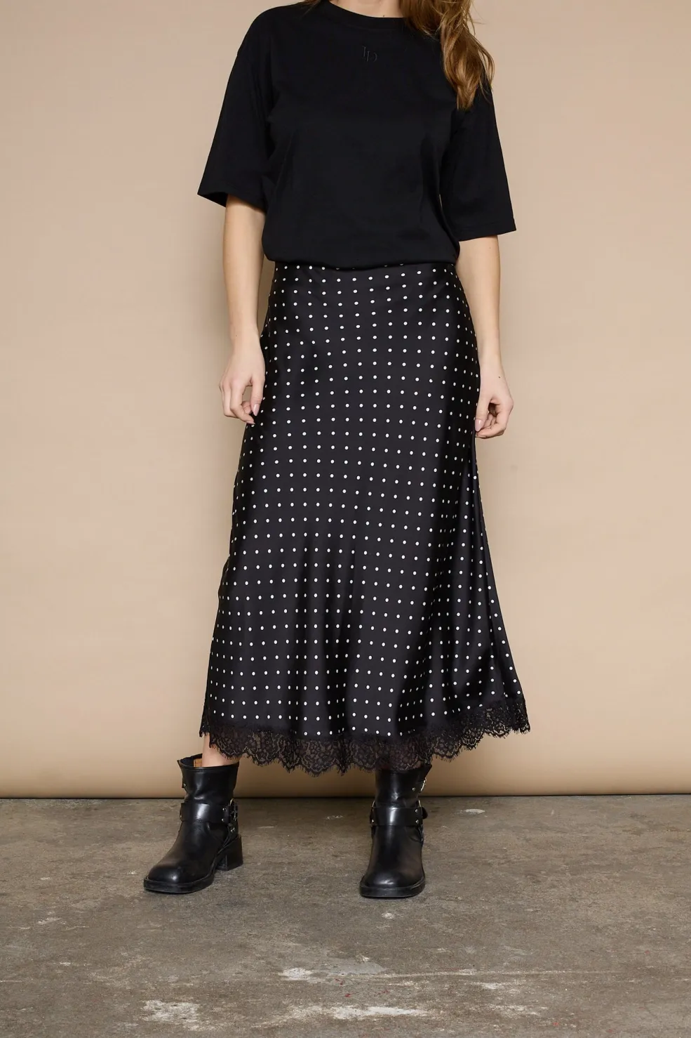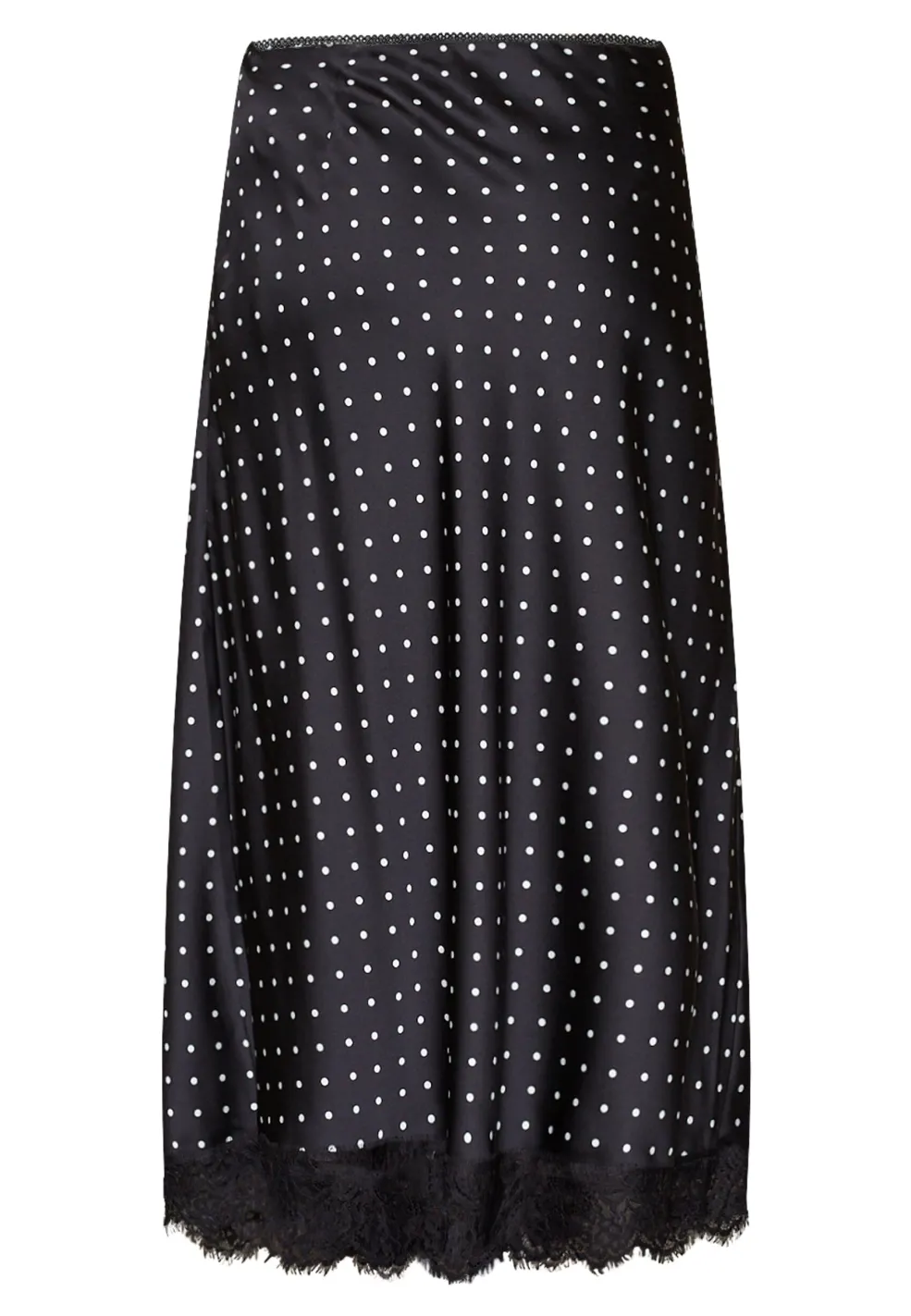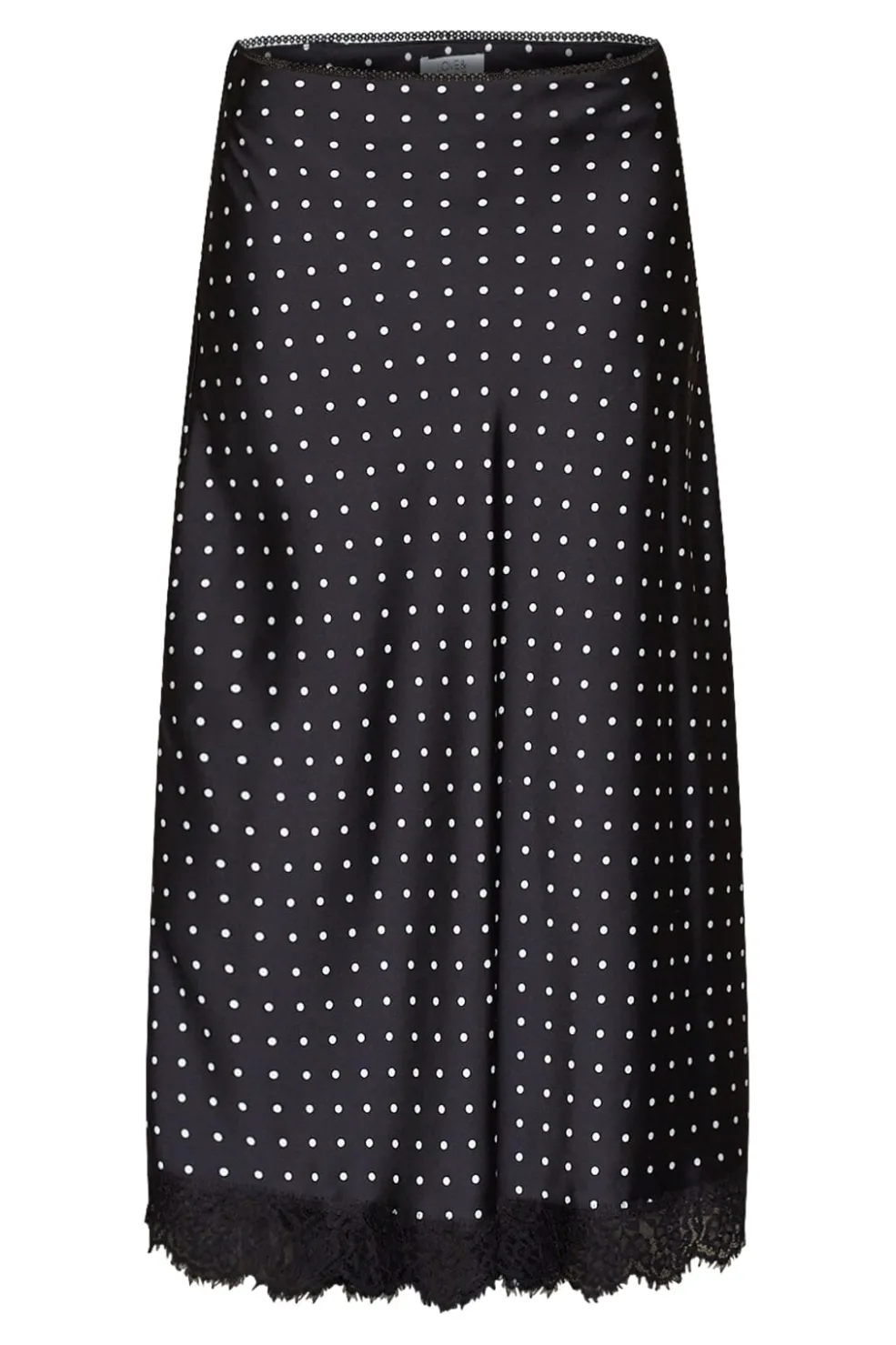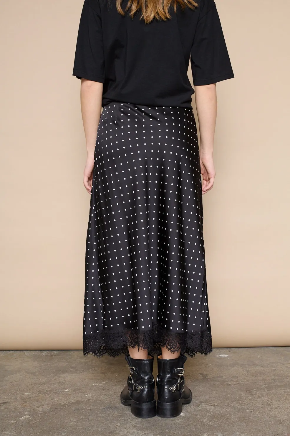 Sort nederdel fra Love & Divine med hvide prikker. Nederdelen har en blondekant nederst og falder til midt på læggen.