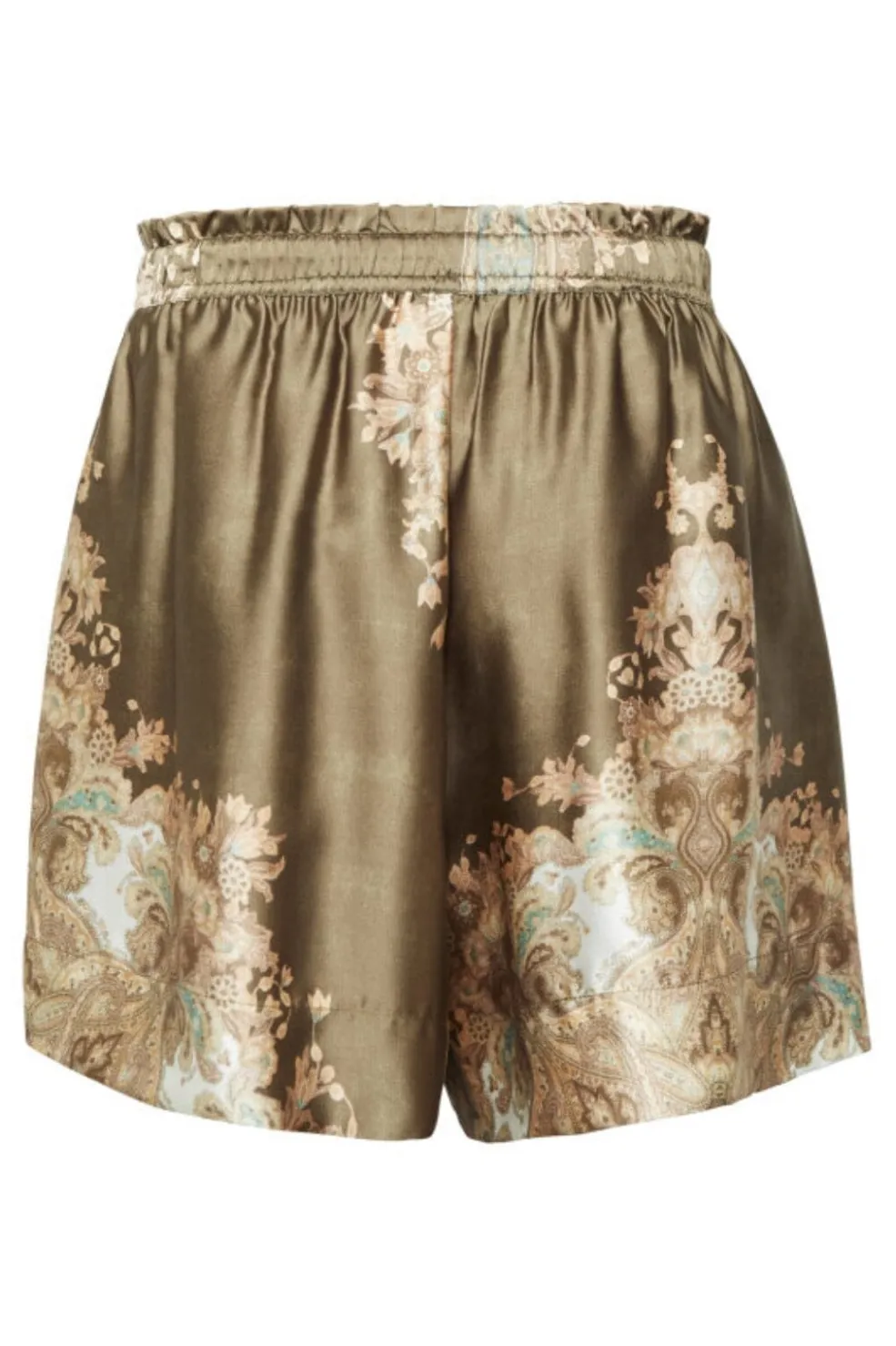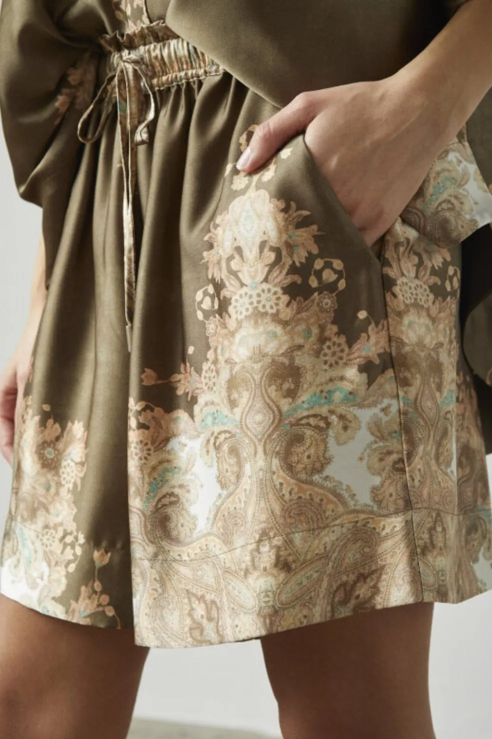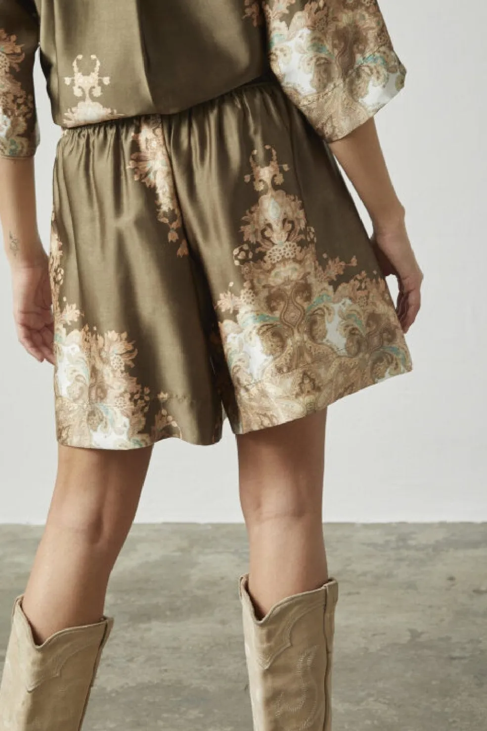 Shorts fra Love & Divine med paisleymønster i khaki grøn. De har en løs pasform og er udstyret med flæser og bindebånd i taljen.