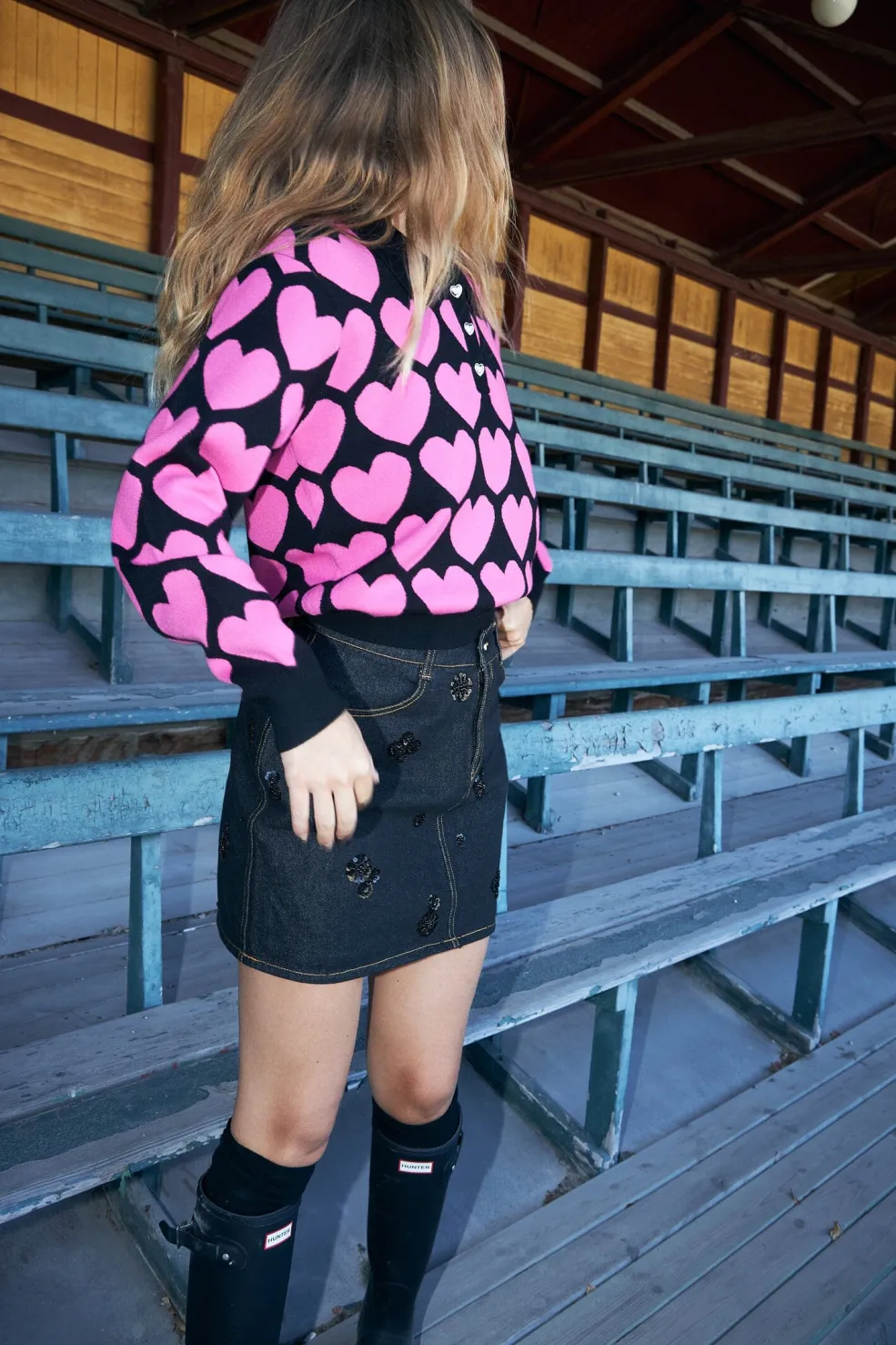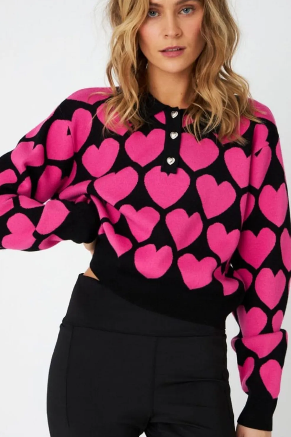 Striktrøje fra Cras med store pink hjerter på sort baggrund. Den har hjerteformede knapper og perledetaljer, som giver den et særpræget design.