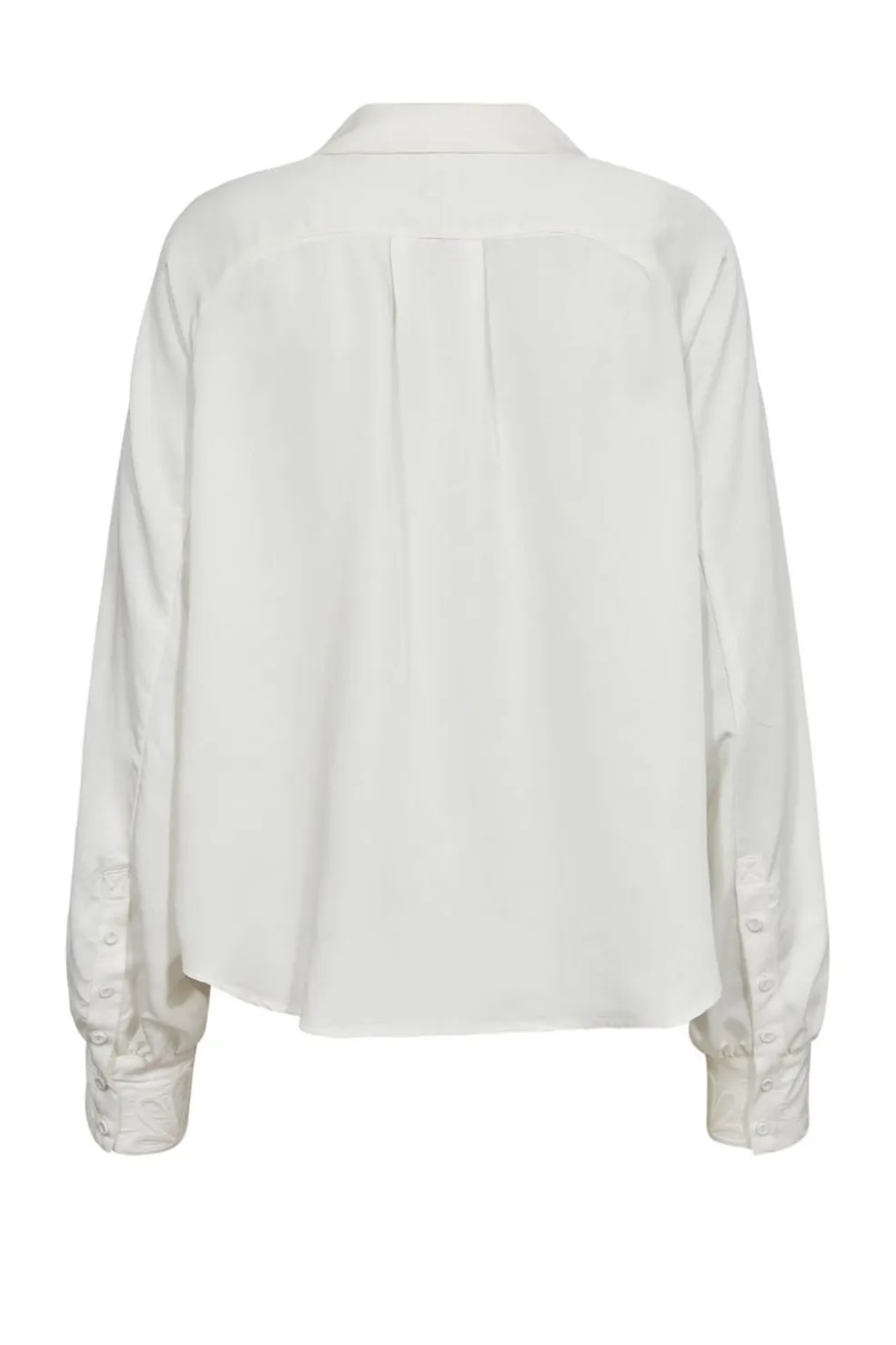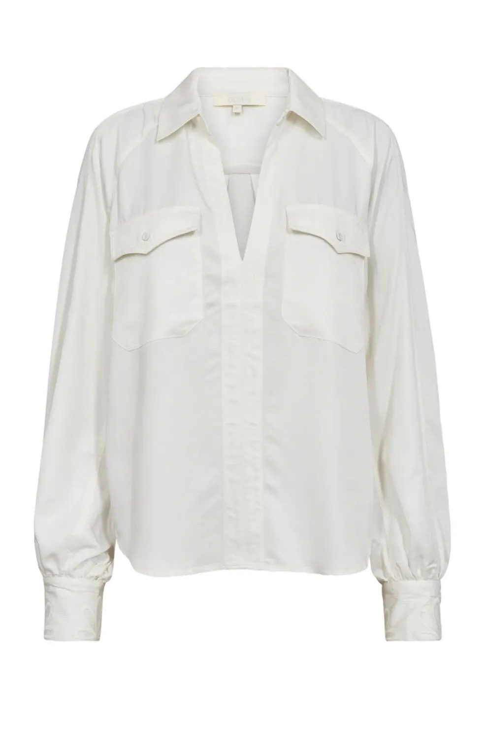 Off-white bluse fra Gossia, lavet af 78 % viskose og 22 % polyester. Blusen har en klassisk skjortestil med krave og to brystlommer.