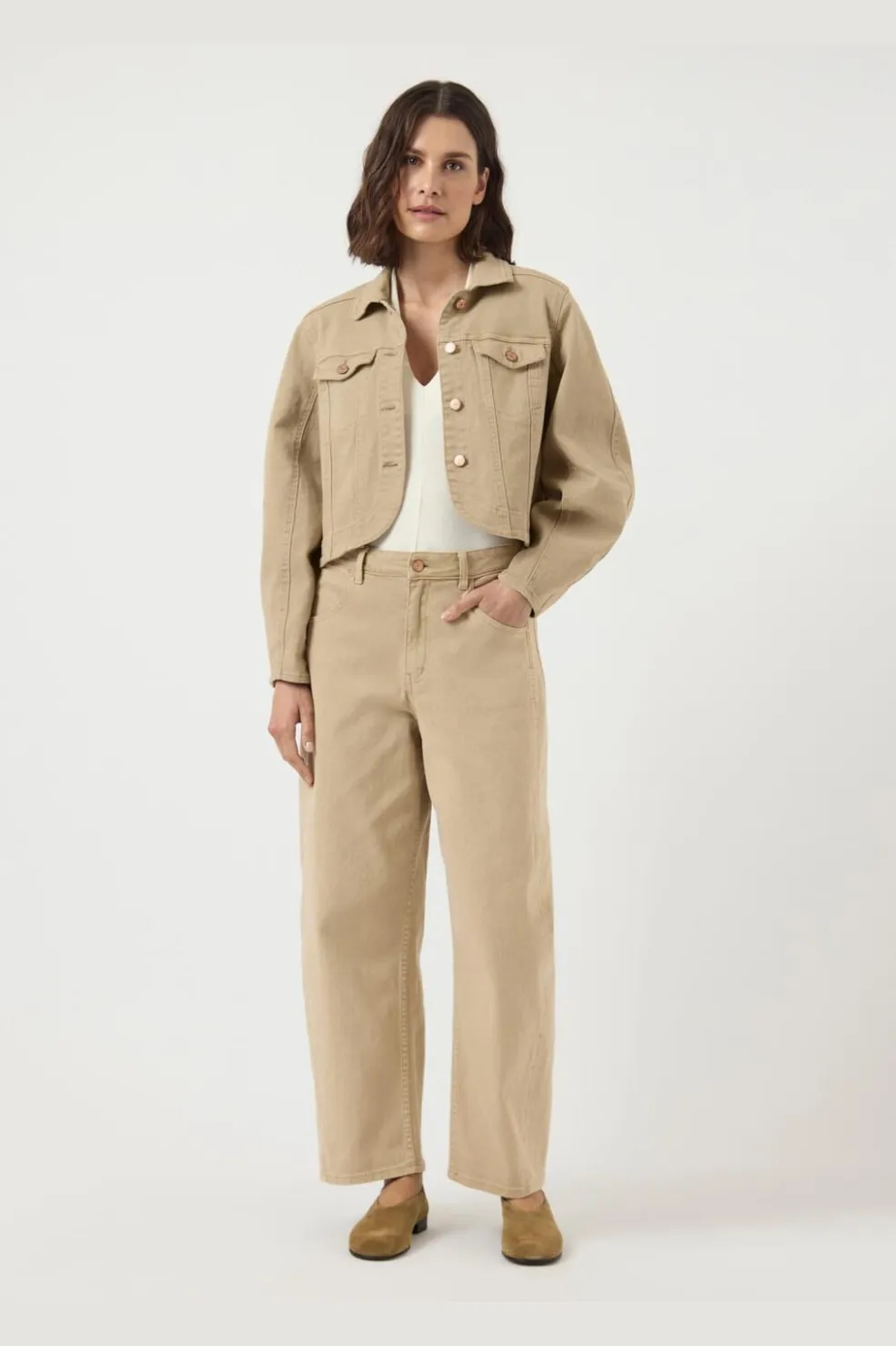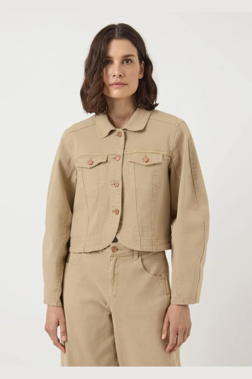 Pak dig ind i overtøj, der blander sofistikeret design med hverdagslethed, perfekt til enhver årstid eller lejlighed.Denne style er lavet af en bomuldsblanding, som kommer i en twillvævning, der giver det klassiske denimlook. Twillvævningen bidrager også til stoffets slidstyrke.- Produkttype: Jakke – Hals: Spredt krave – Lukning: Knaplukning – Længde/størrelse: Cropped