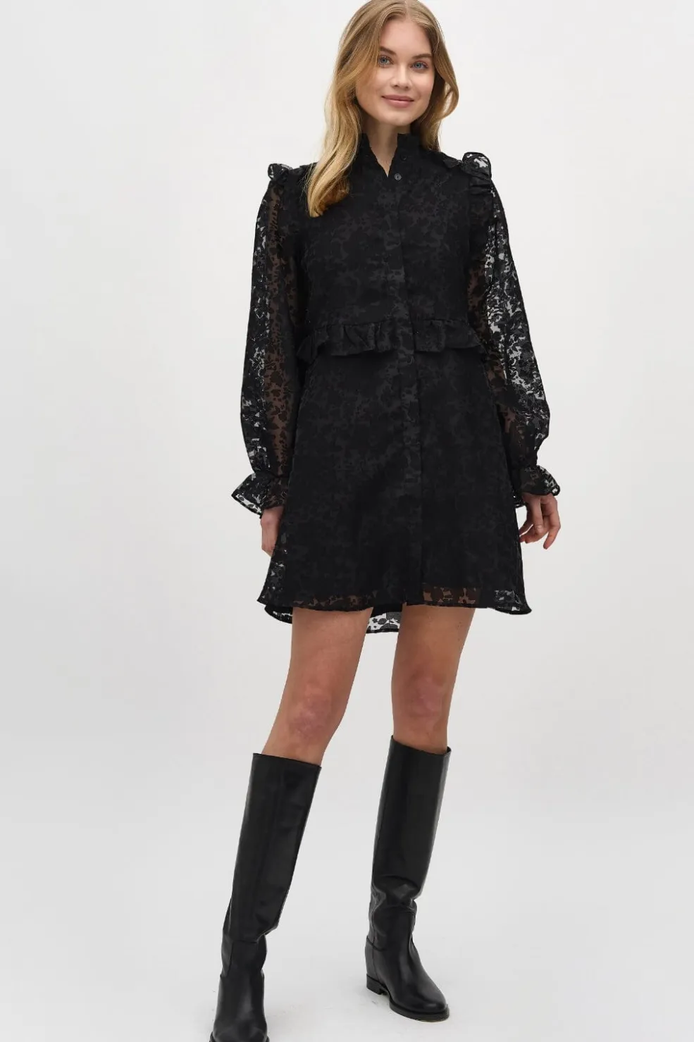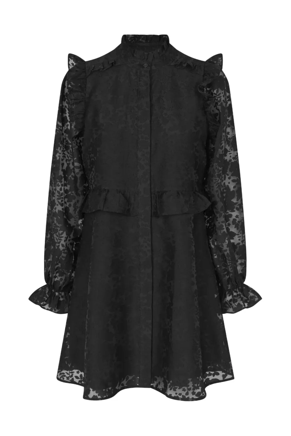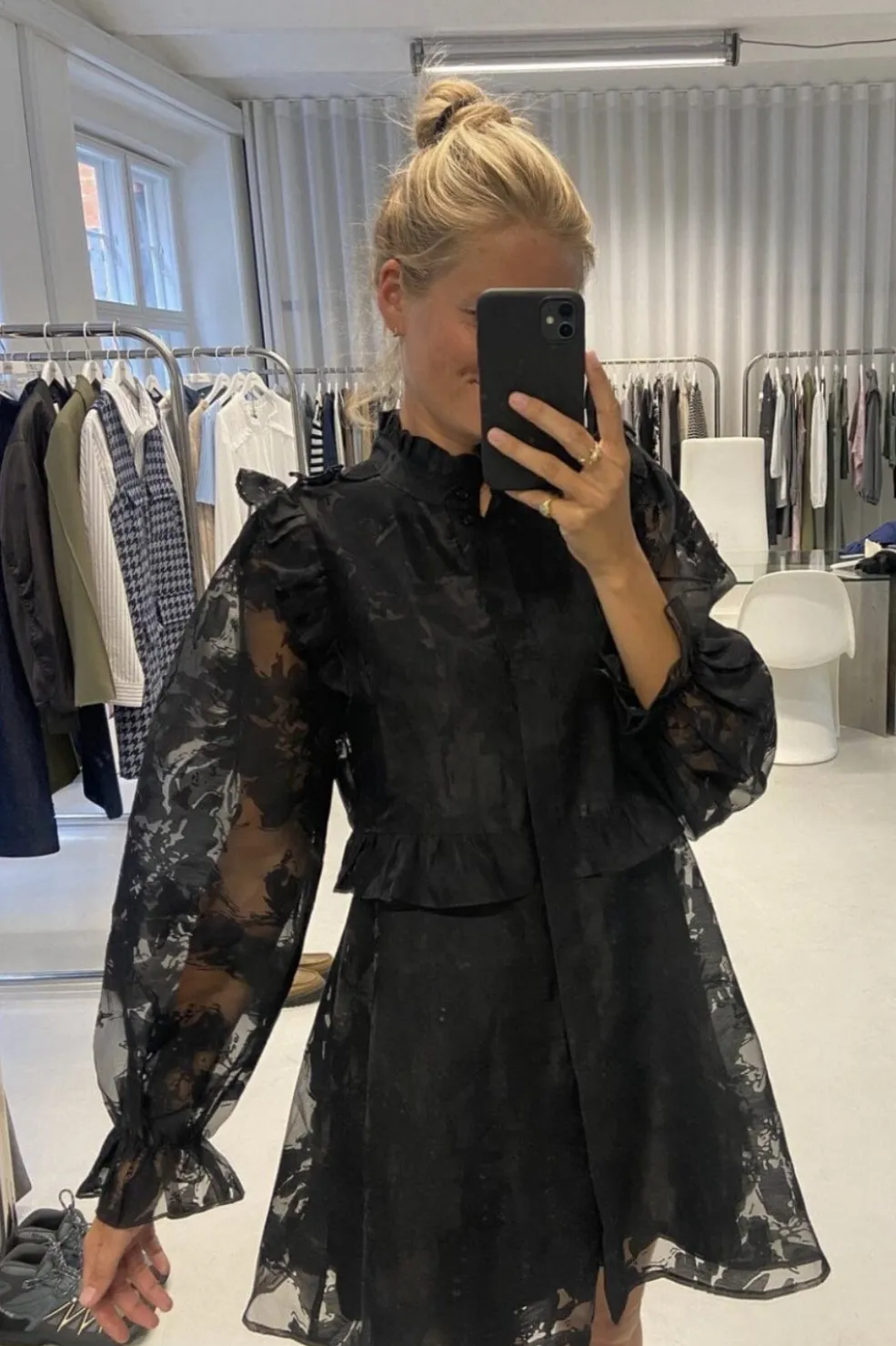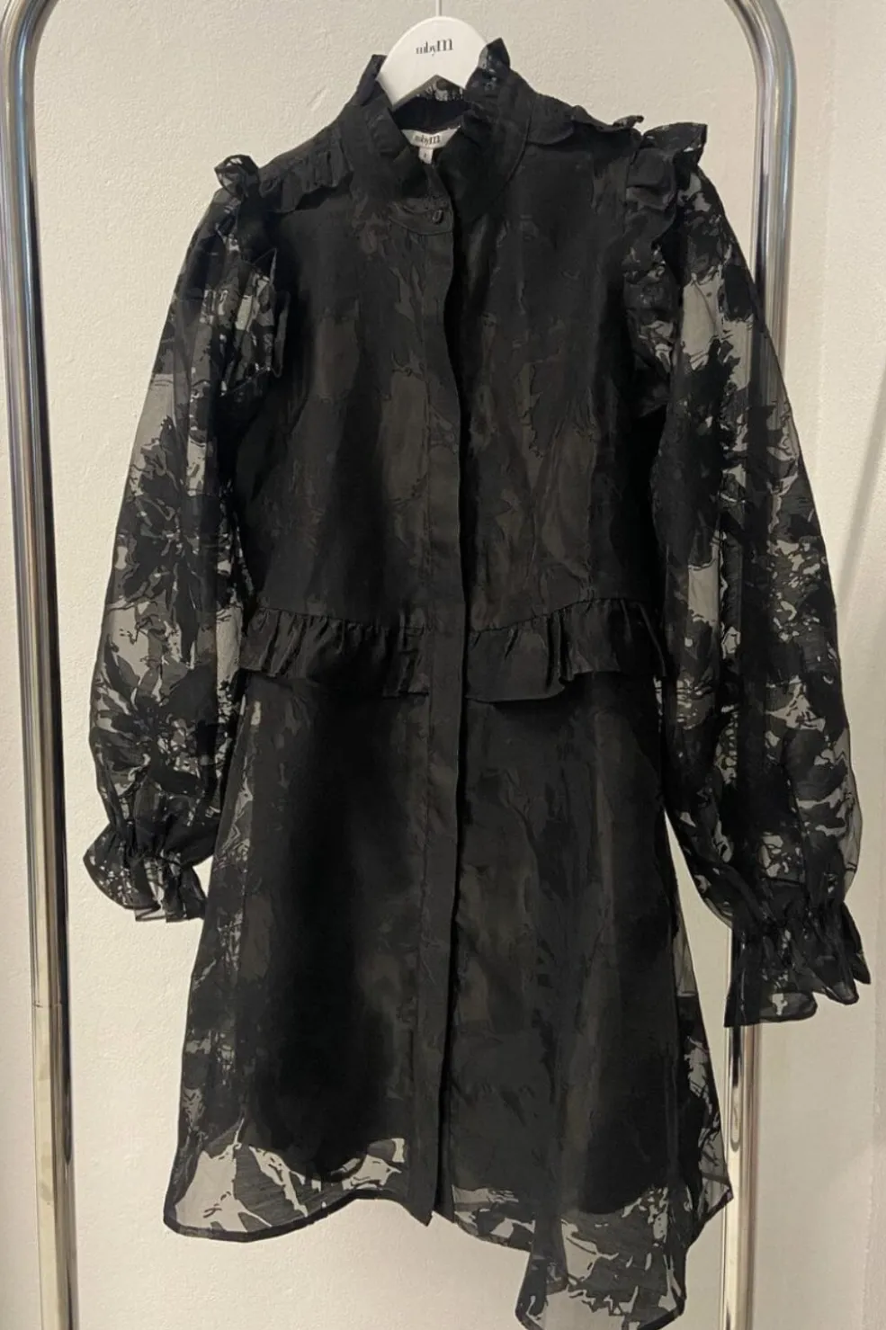 Sort festkjole fra MbyM med gennemsigtigt blondestof og blomstermønster. Kjolen har høj hals, lange ærmer og når til midt på låret.