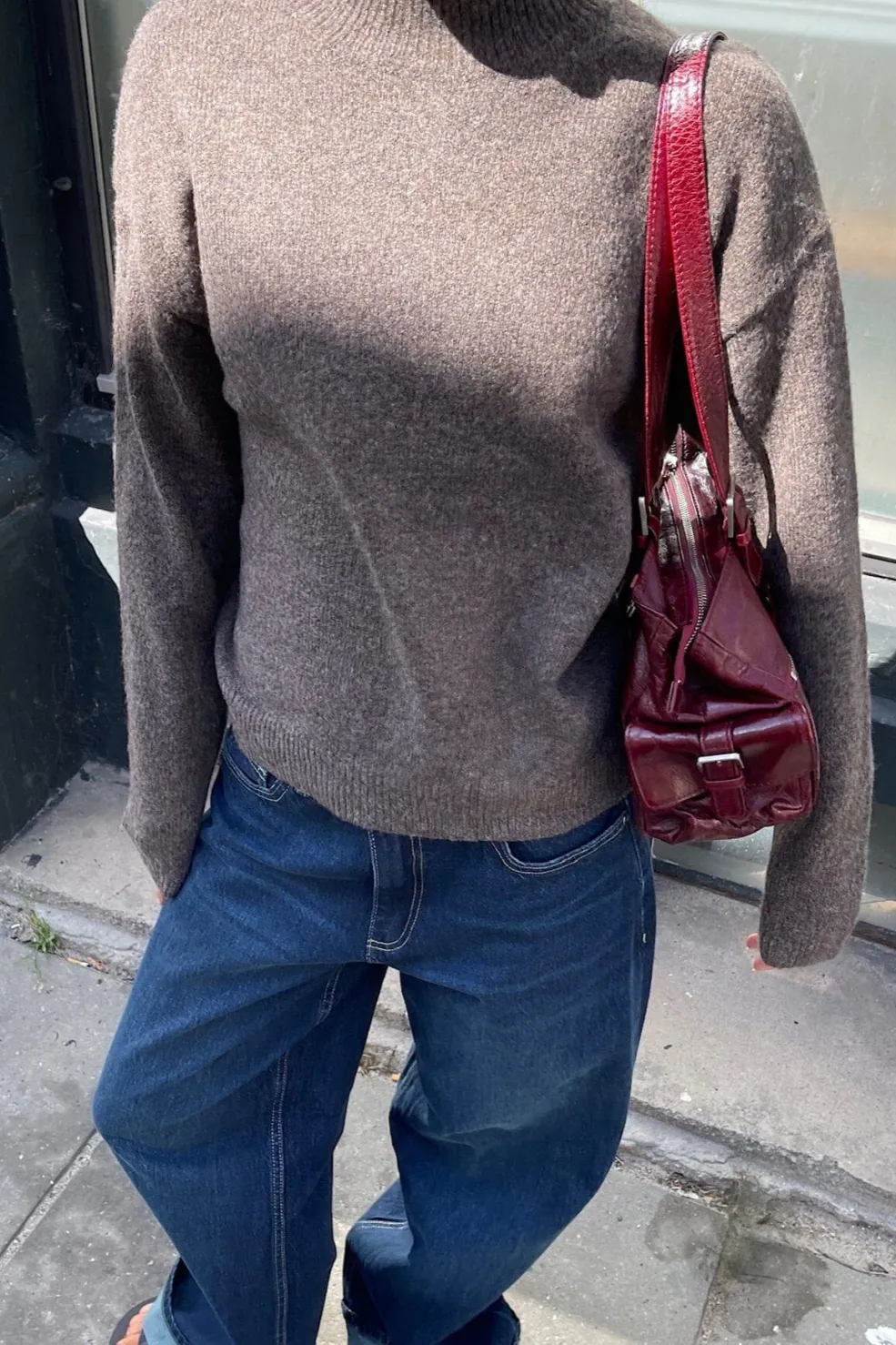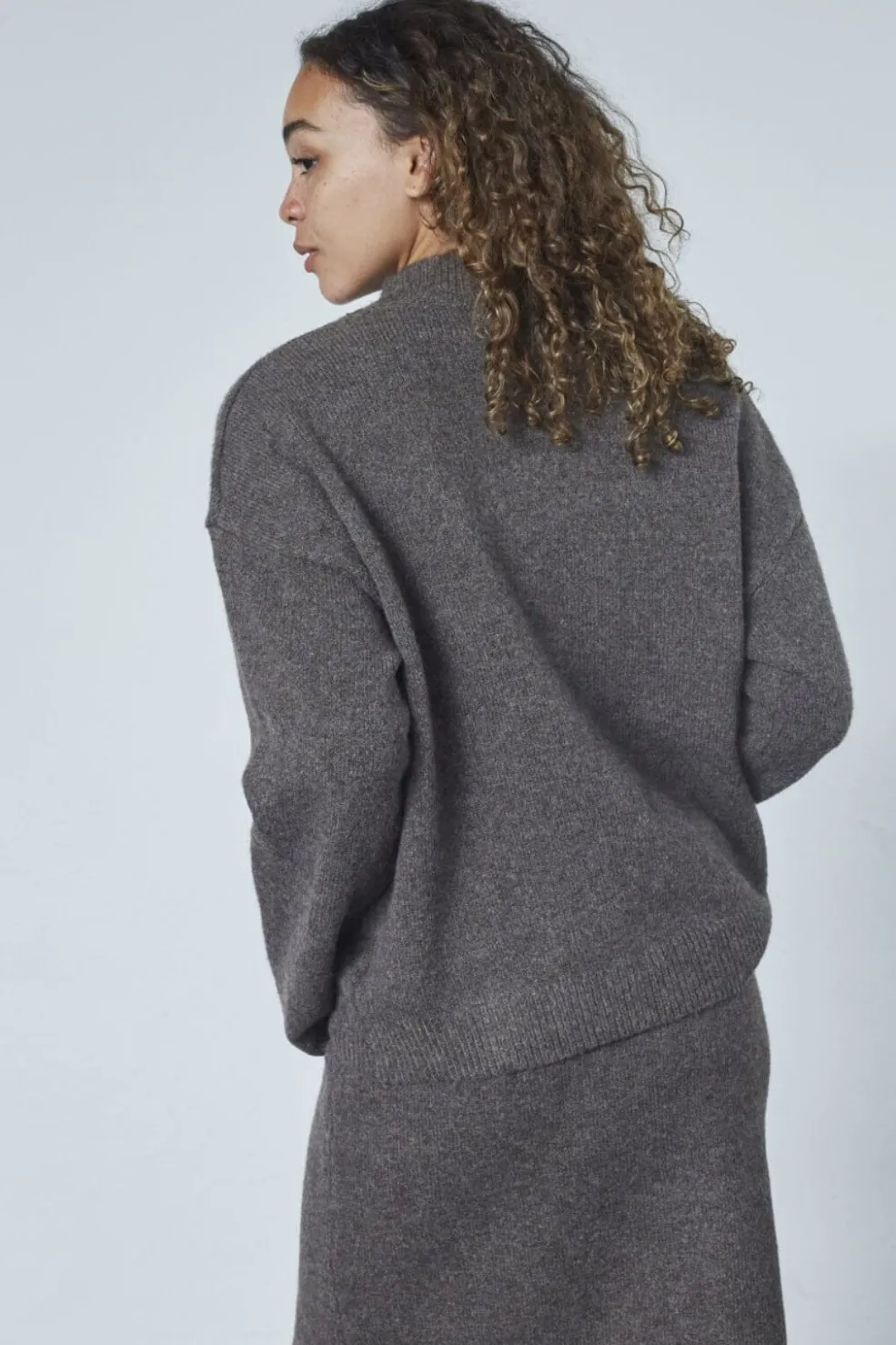 Strikket sweater fra Sisters Point i brun og grå melange. Sweateren har høj halsudskæring, lange ærmer og en løs pasform.