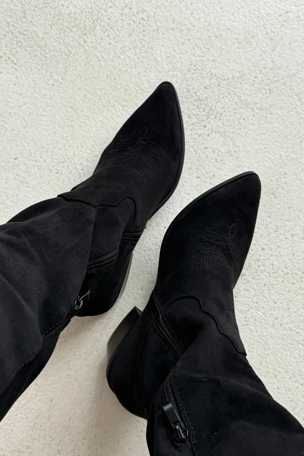 Sort støvle fra Bloom med blokhæl. Støvlen har en hælhøjde på 5-8 cm og en mandelformet snude. Den passer til både hverdag og fest.