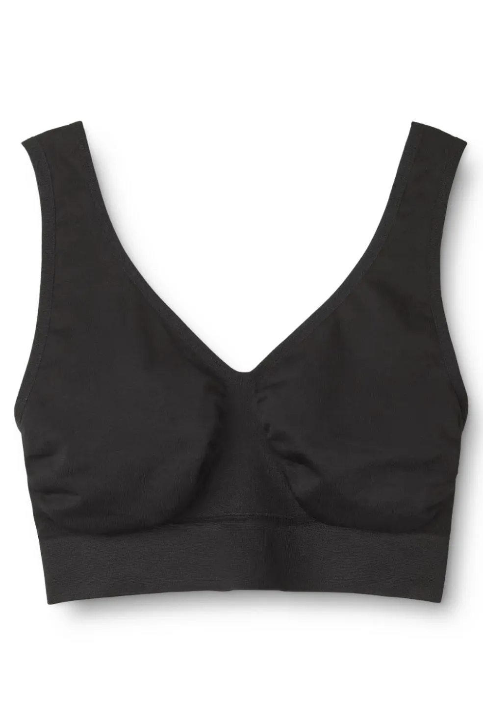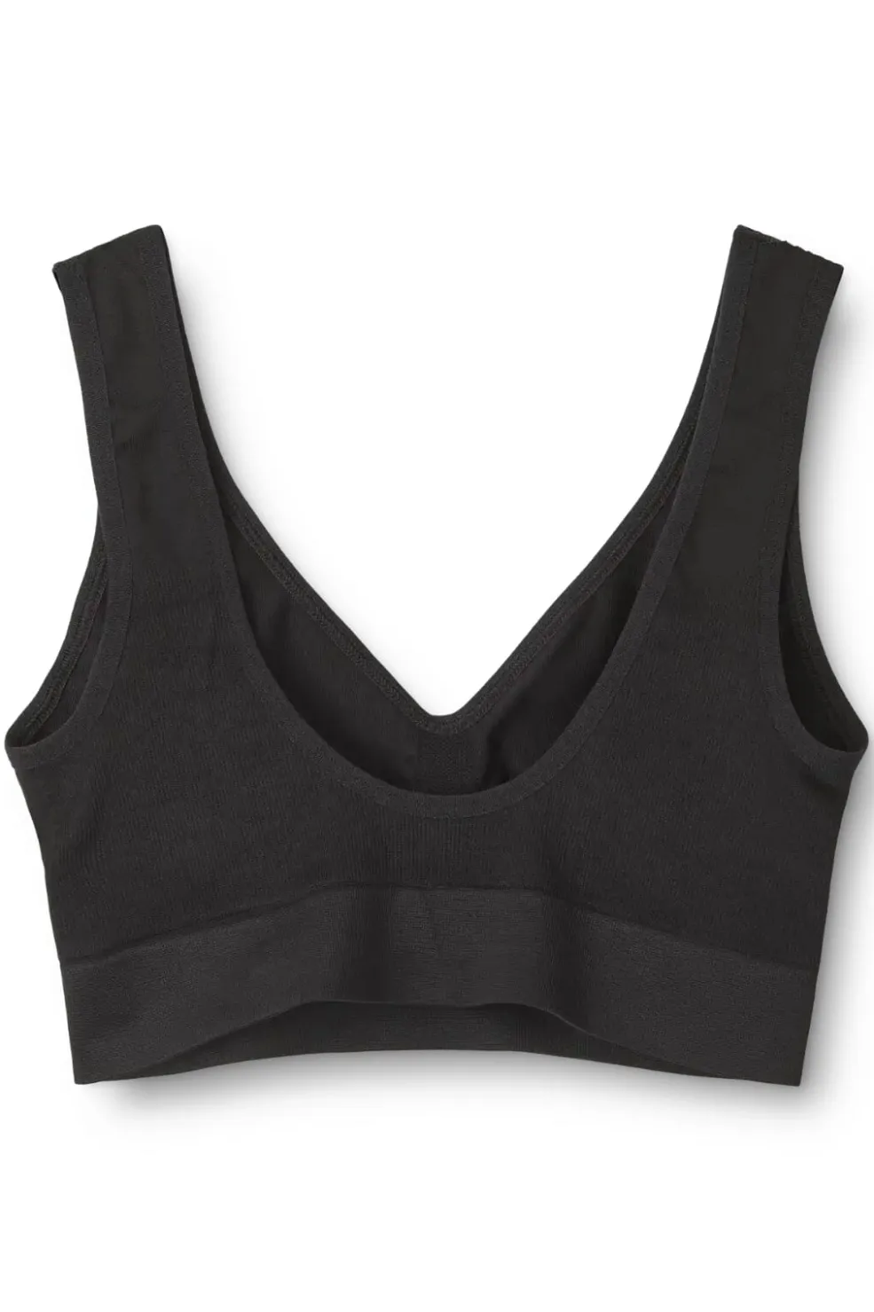 Sort bra-top fra Molly&my Wardrobe med V-hals og brede stropper. Den har en stabil pasform og er lavet i et blødt materiale med god stræk.