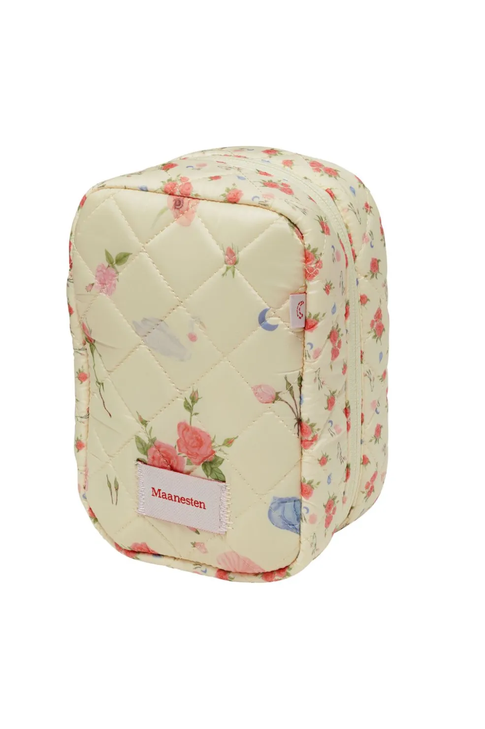 Makeup pung fra Maanesten med quiltet overflade i creme. Pungen har et blomstermønster med roser og skaller i rosa og blå nuancer. Den er fremstillet af genanvendt polyester med bomuldsfor.