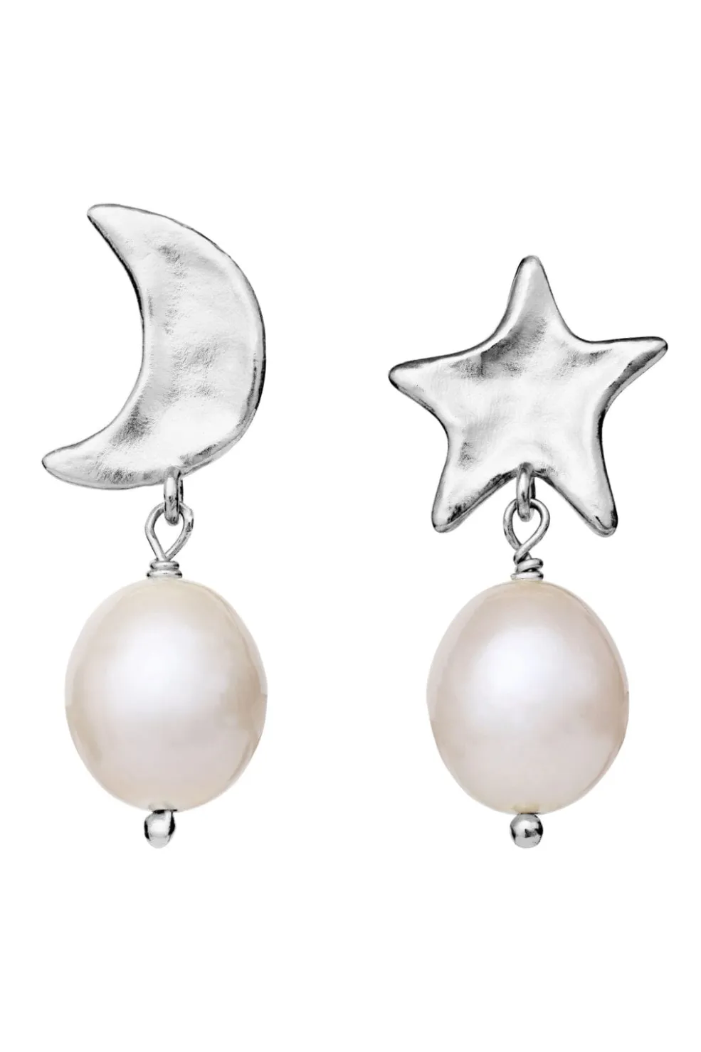Sølvøreringe fra Maanesten med måne- og stjerneformede vedhæng. De asymmetriske øreringe har hvide perler og en skinnende overflade i genanvendt sterling sølv.