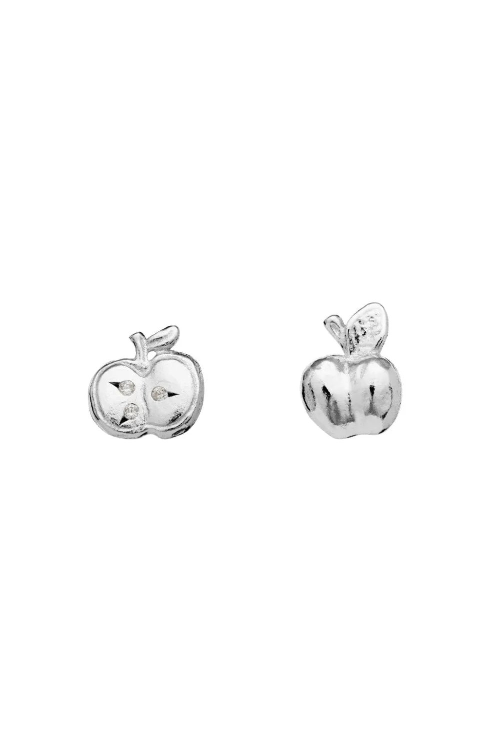 Sølvfarvede øreringe fra Maanesten med æbleformet design. De to øreringe har forskellige æbledesigns – én med blad og én med afrundet form. Øreringene er prydet med hvide zirkonia-stene.