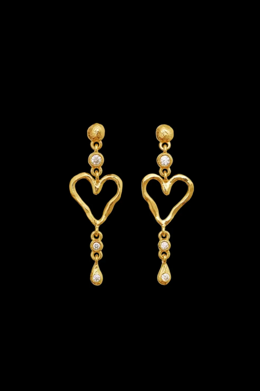 Øreringe fra Maanesten, lavet af genanvendt sterlingsølv belagt med 18 karat guld. Det hjerteformede design har hvide zirkoner langs kæden.