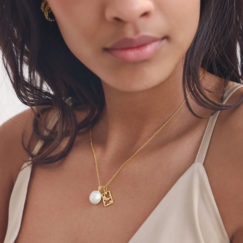 Vedhæng fra Maanesten med en rektangulær åben ramme. Designet indeholder en halvmåne og små cirkulære elementer i guld.