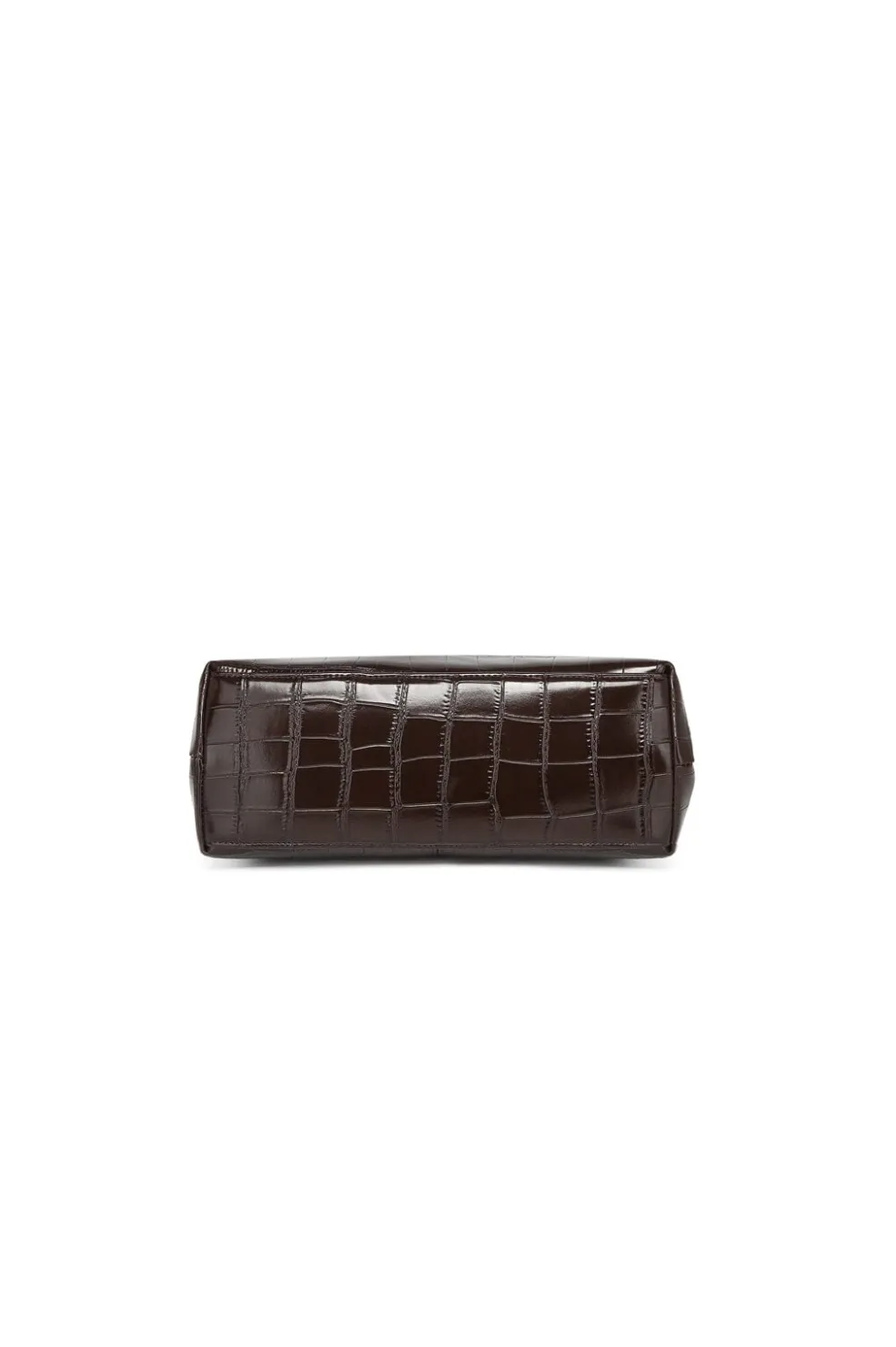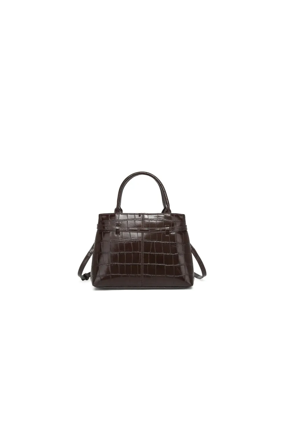 Mørkebrun taske fra Noella med krokodillemønster. Tasken har top-håndtag og aftagelig skulderrem samt en bælte-detalje.