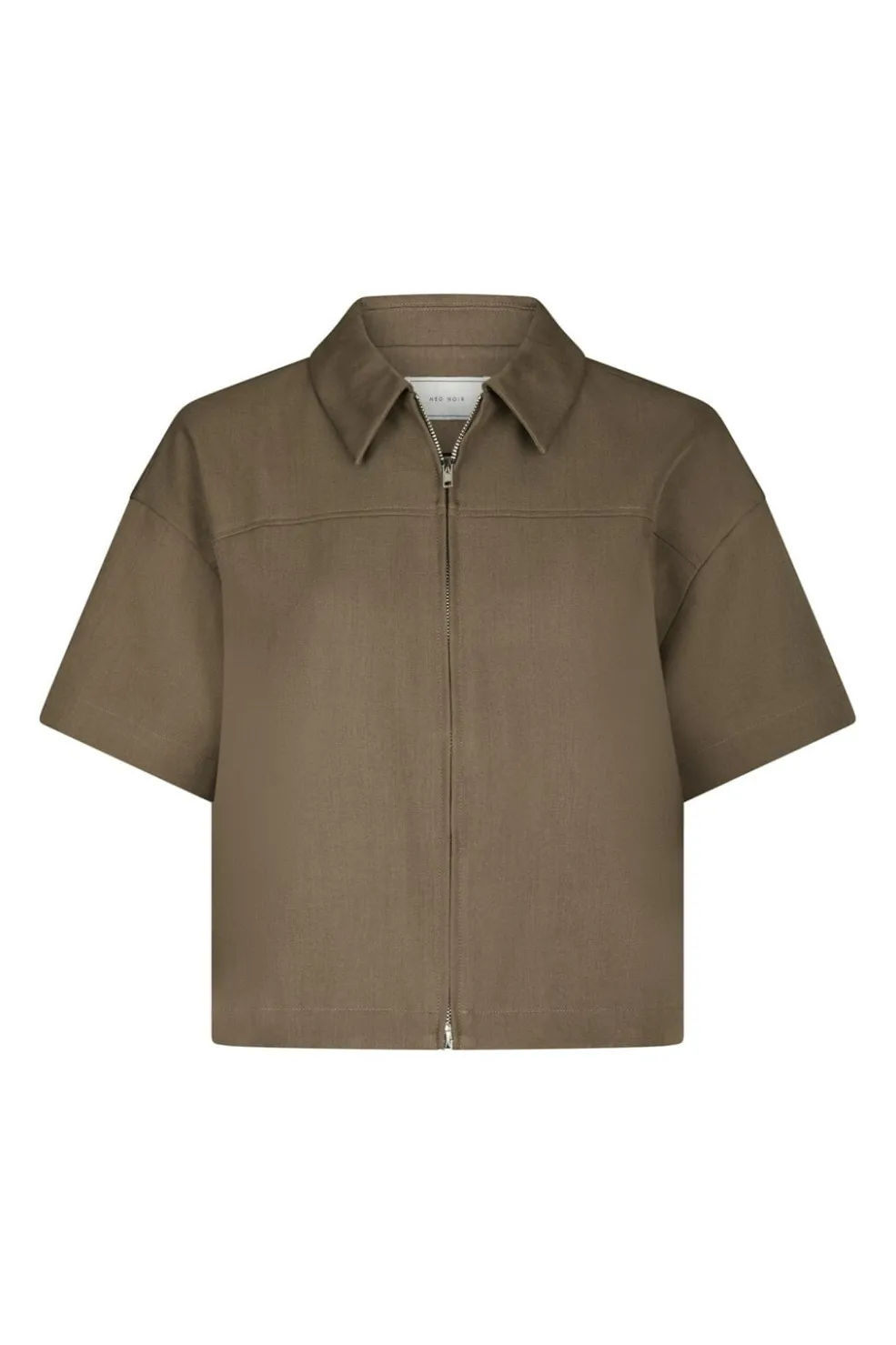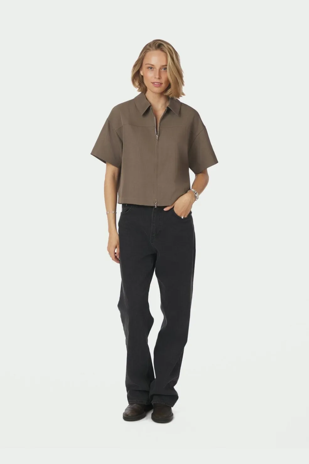 Bluse fra Neo Noir i taupe med skjortekrave og løs pasform. Den er fremstillet i et struktureret stof med dekorative syninger og har en praktisk lynlås foran.