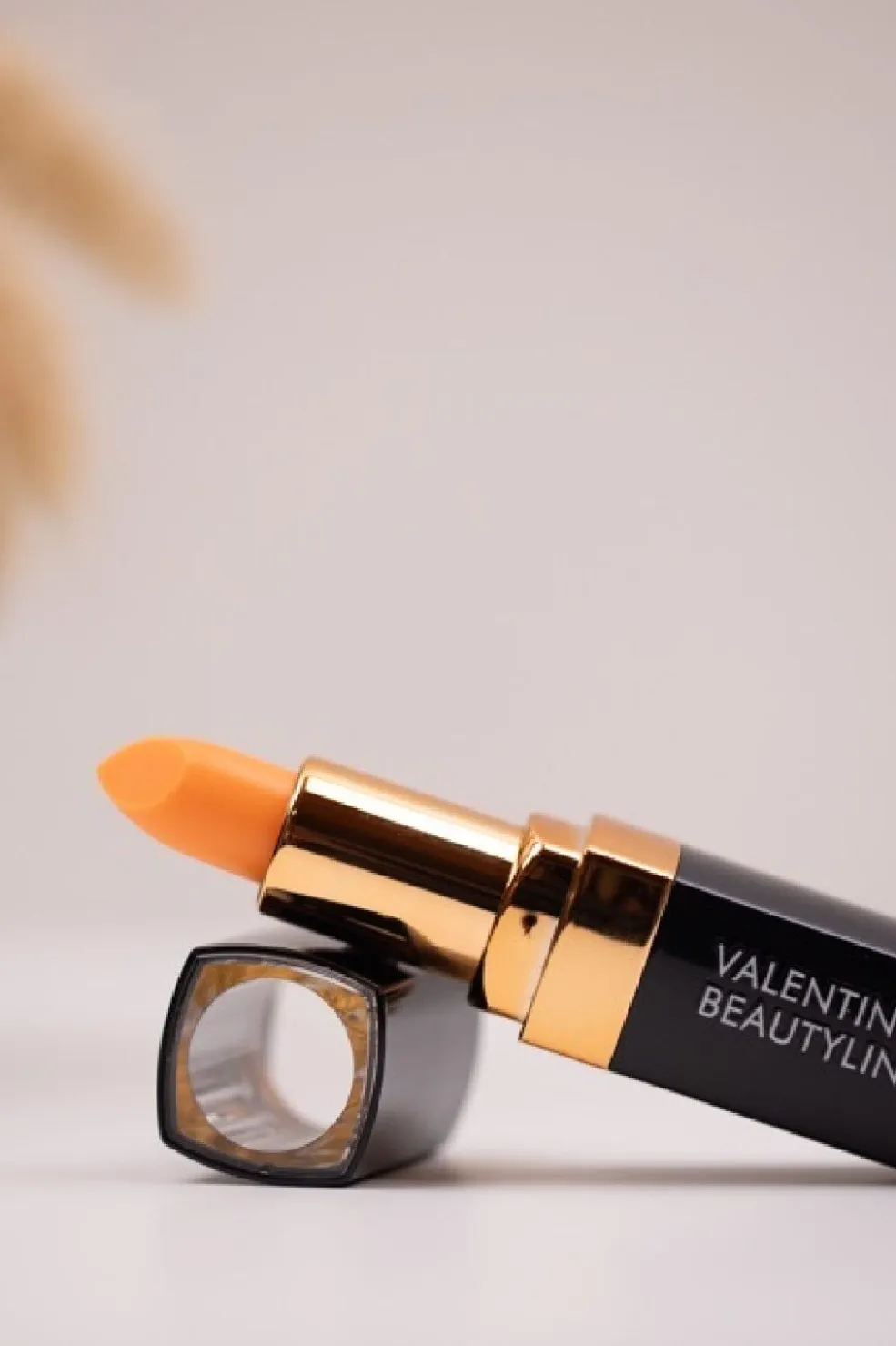 Orange læbestift fra Valentin Beautyline med solsikke- og jojobaolie. Læbestiften tilpasser sig din pH-værdi og kan bruges både på læberne og kinderne.