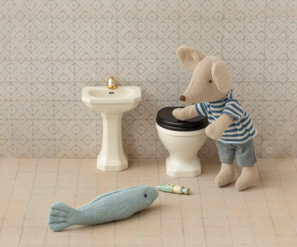 Dimensionerne passer til badeværelset i SuitCasa musehuset og giver vasken de rette proportioner i forhold til Mailegs legetøjsmus.