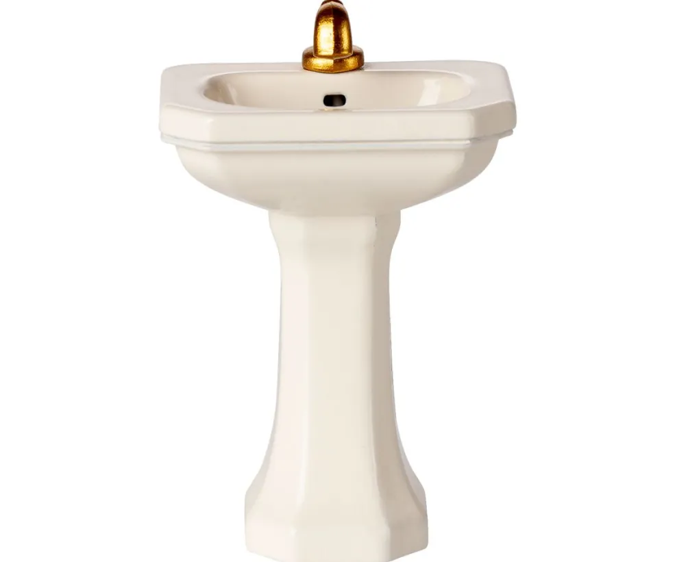 En miniature badeværelsesvask fra Maileg til legetøjsmus. Vasken er råhvid med en gylden hane og står på en enkelt søjle.