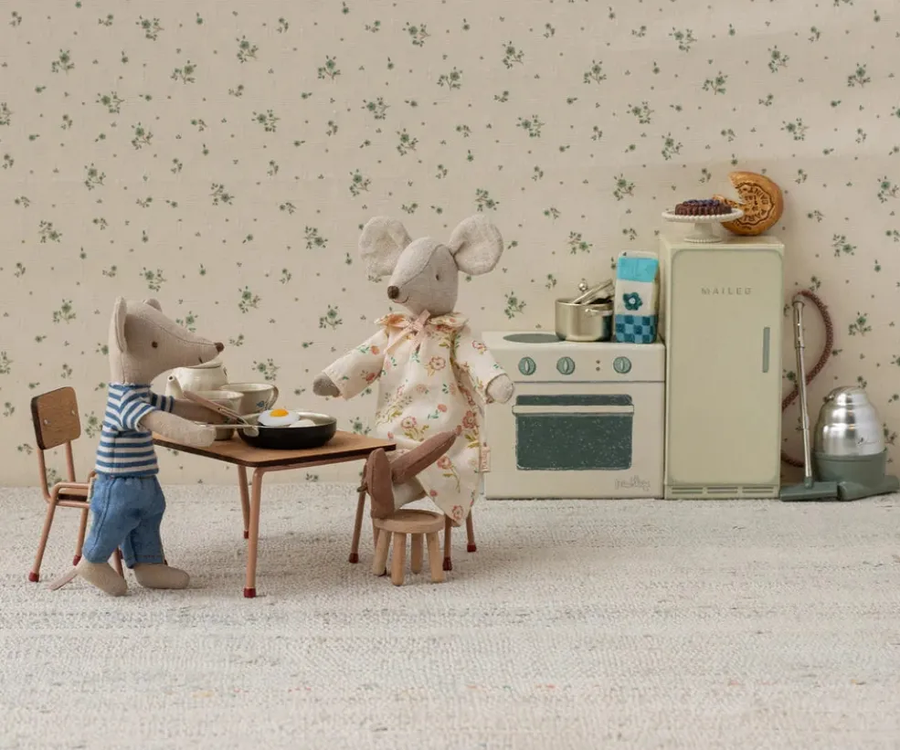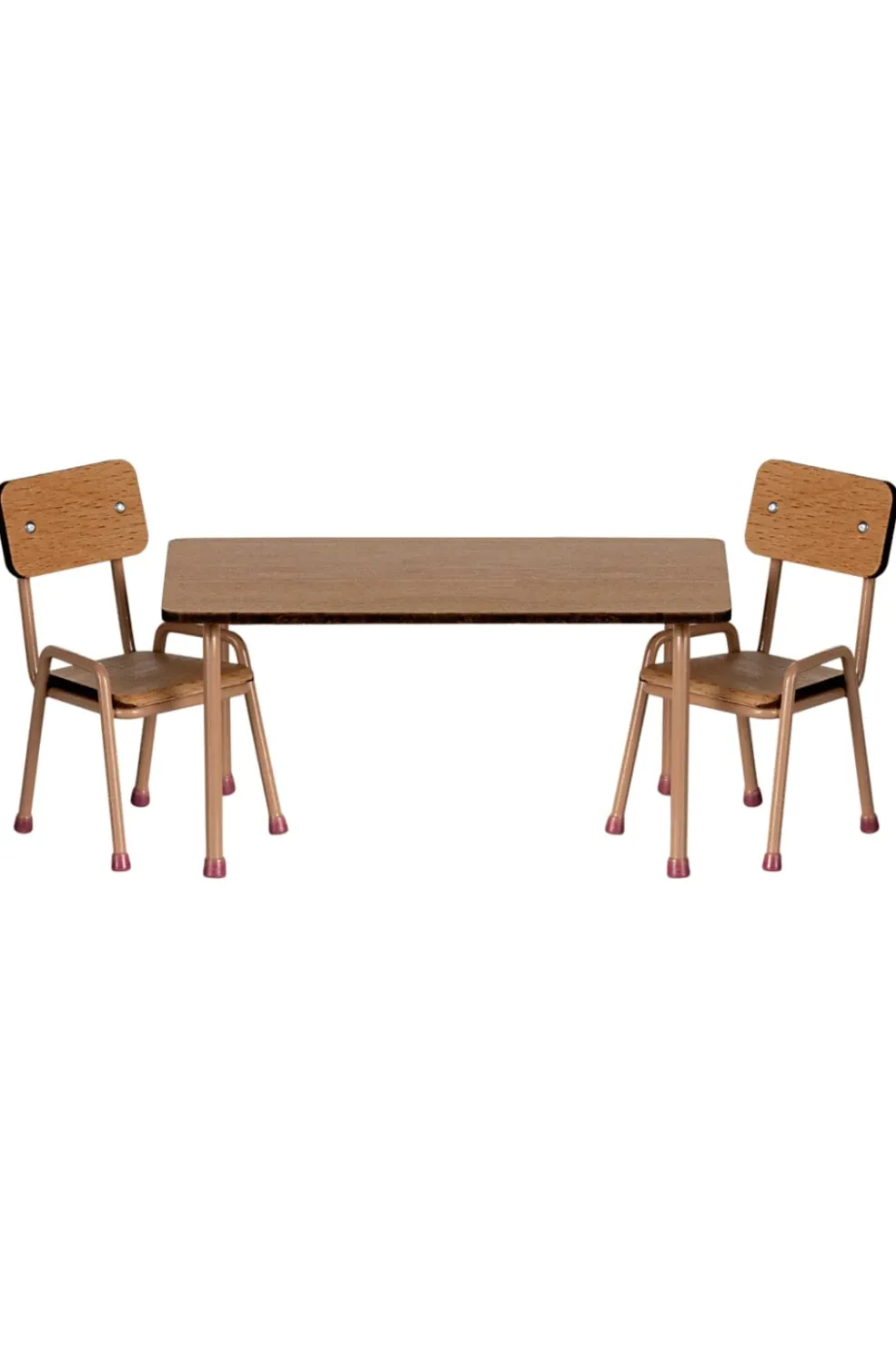 Bord og stole fra Maileg i bøgetræ og metal. Møblerne har pink ben og passer til Maileg-musene. Bordet og stolene er lavet af holdbare materialer med håndmalede detaljer.