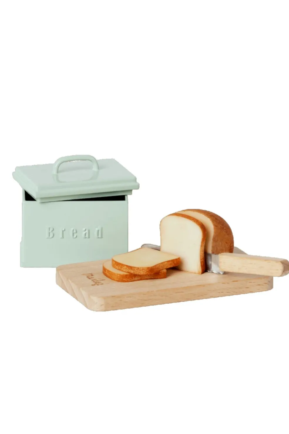 Lysegrøn brødkasse fra Maileg med tilhørende skærebræt og redskaber. Brødkassen har Bread indgraveret på forsiden og er fremstillet i en kombination af træ, metal og polyresin.