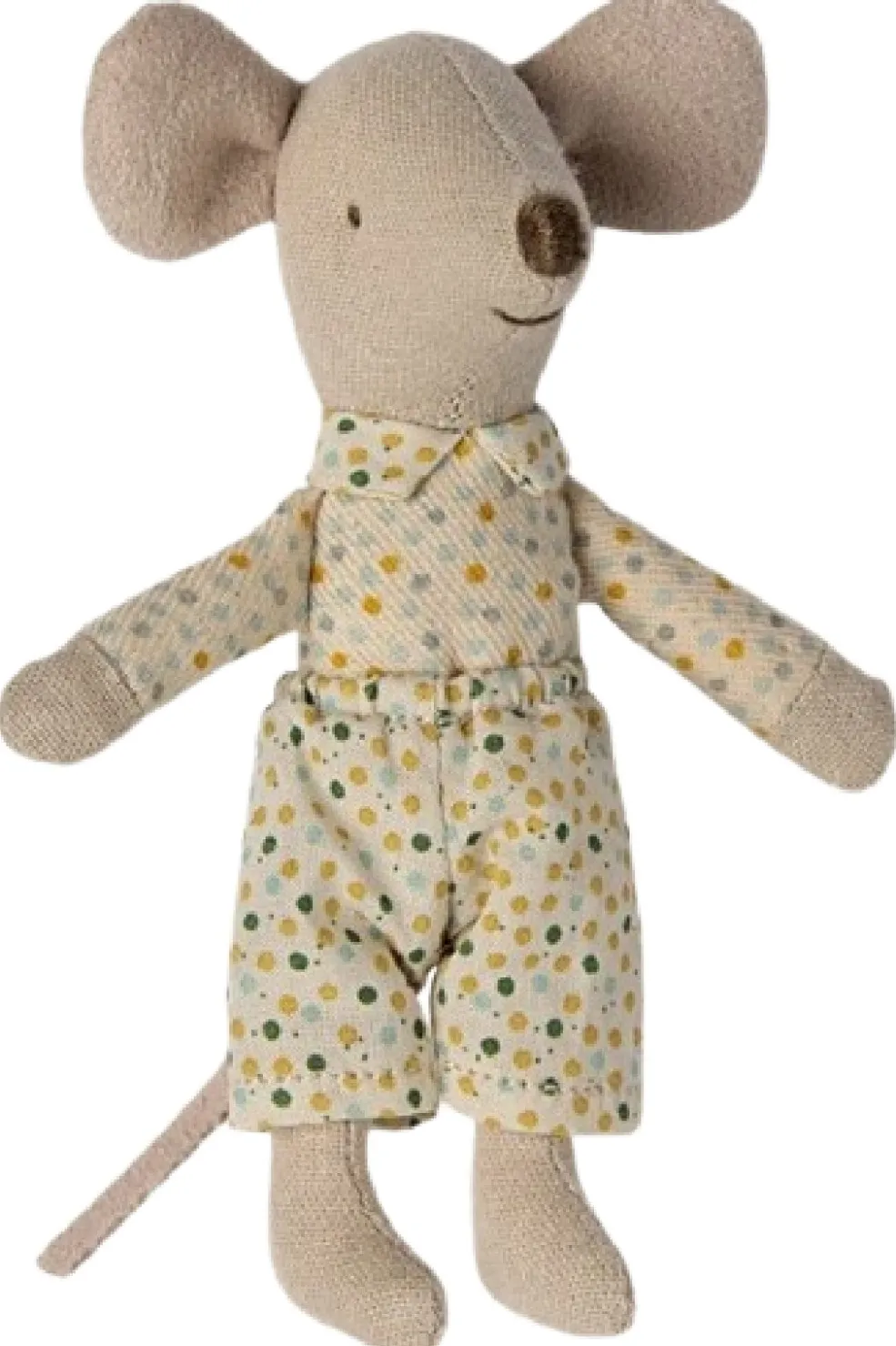 Beige stofmus fra Maileg i en vintage-inspireret tændstikæske. Musen har tøj med prikker og kommer med en lille pude og et tæppe i æsken.