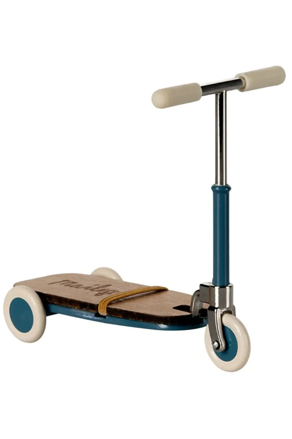 Blåt løbehjul fra Maileg med træplade og hvide hjul. Løbehjulet er designet til leg med Maileg-mus og har praktiske detaljer, der holder musen sikkert på plads under legen.