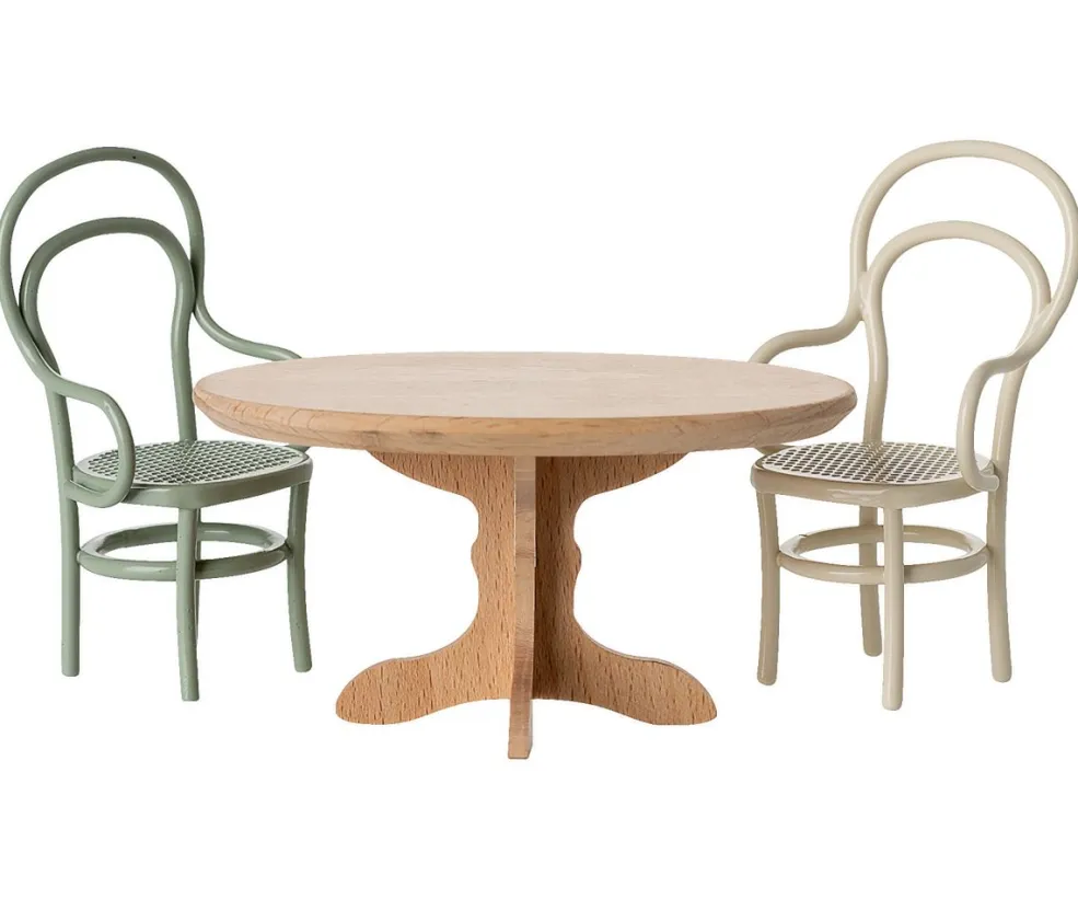 Et ovalt spisebord fra Maileg i træ med en naturlig finish i beige. Bordet er designet til mus-figurer og passer til miniaturemøbler.