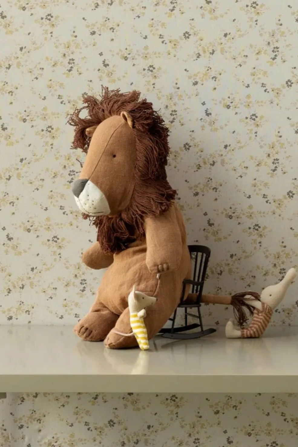 Brun løve fra Maileg Safari Friends-kollektionen. Den har en håndlavet manke og er fremstillet i en kombination af linned og bomuld, hvilket giver en blød og holdbar overflade.