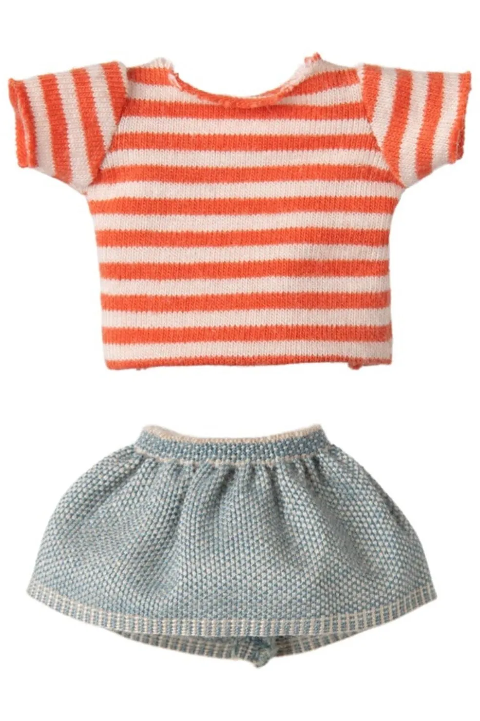 En blød legetøjsmus fra Maileg med rødstribet t-shirt og denimnederdel. Musen har magneter i hænderne og kommer i en dekorativ æske.
