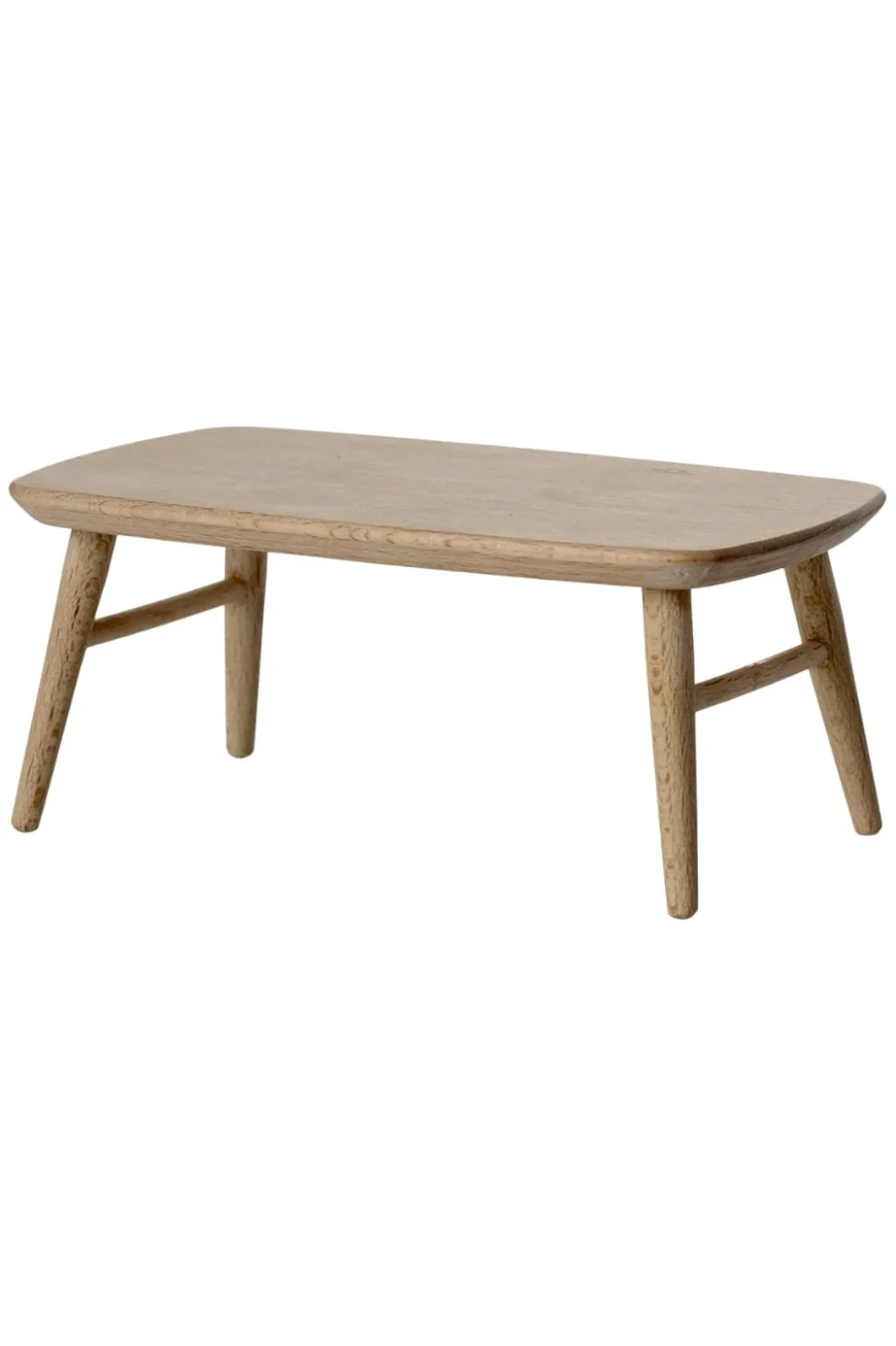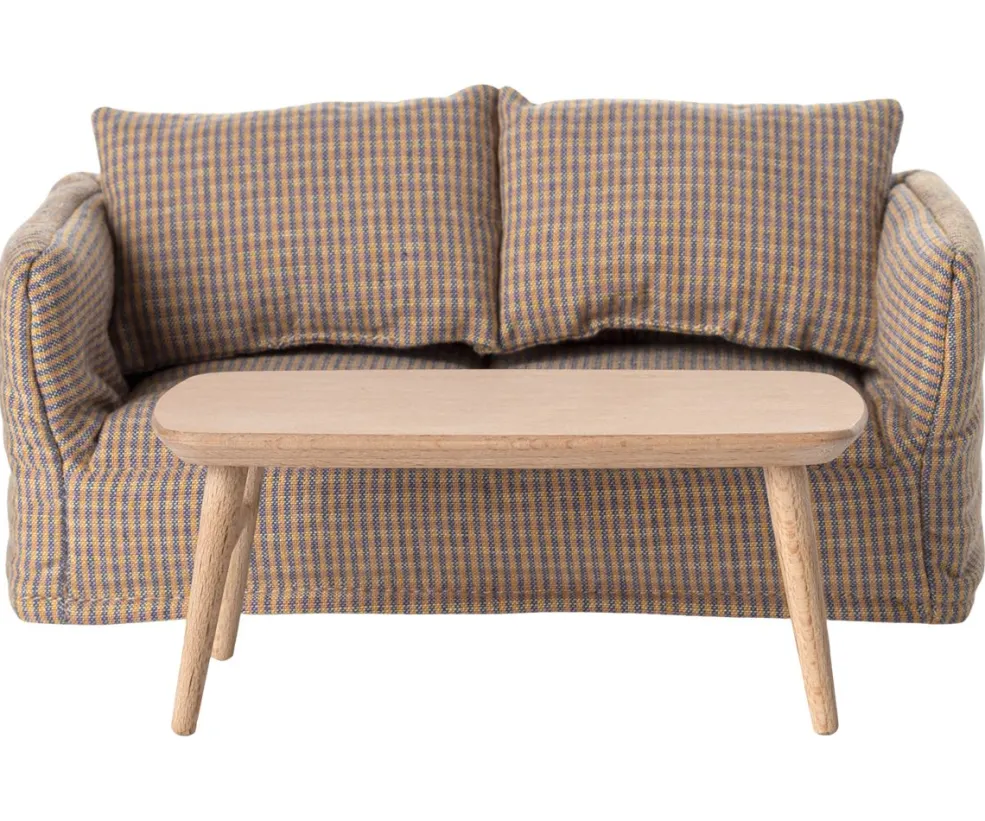 Et sofabord i træ fra Maileg, designet til musestørrelse møbler. Bordpladen er afrundet rektangulær med fire skråtstillede ben i en naturlig beige farve.