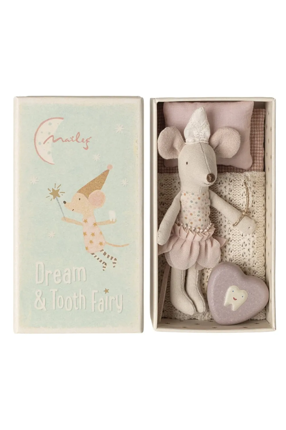 En lille tandfe-mus fra Maileg i en tændstikæske med teksten Dream & Tooth Fairy. Musen er iført en prikket top og en lyserød nederdel med hat.