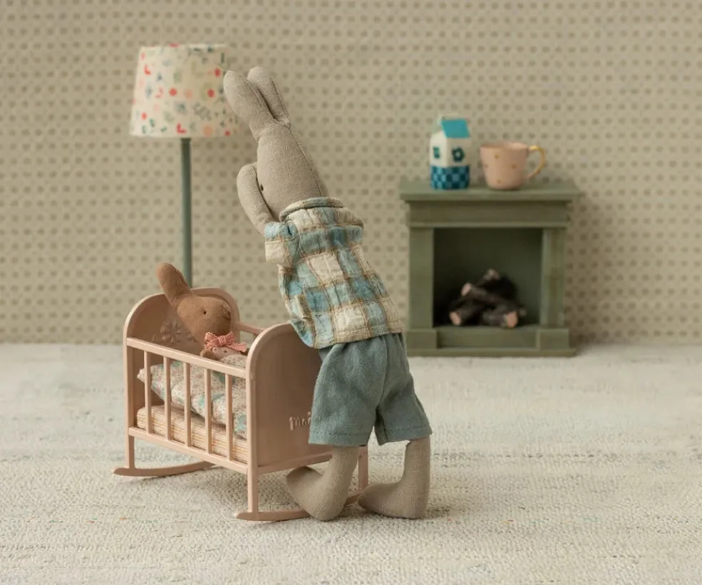 Lyserød vugge fra Maileg med afrundede ben og blomsterprægning på hovedgærdet. Vuggen har en mønstret madras og er designet til legetøjsmus.