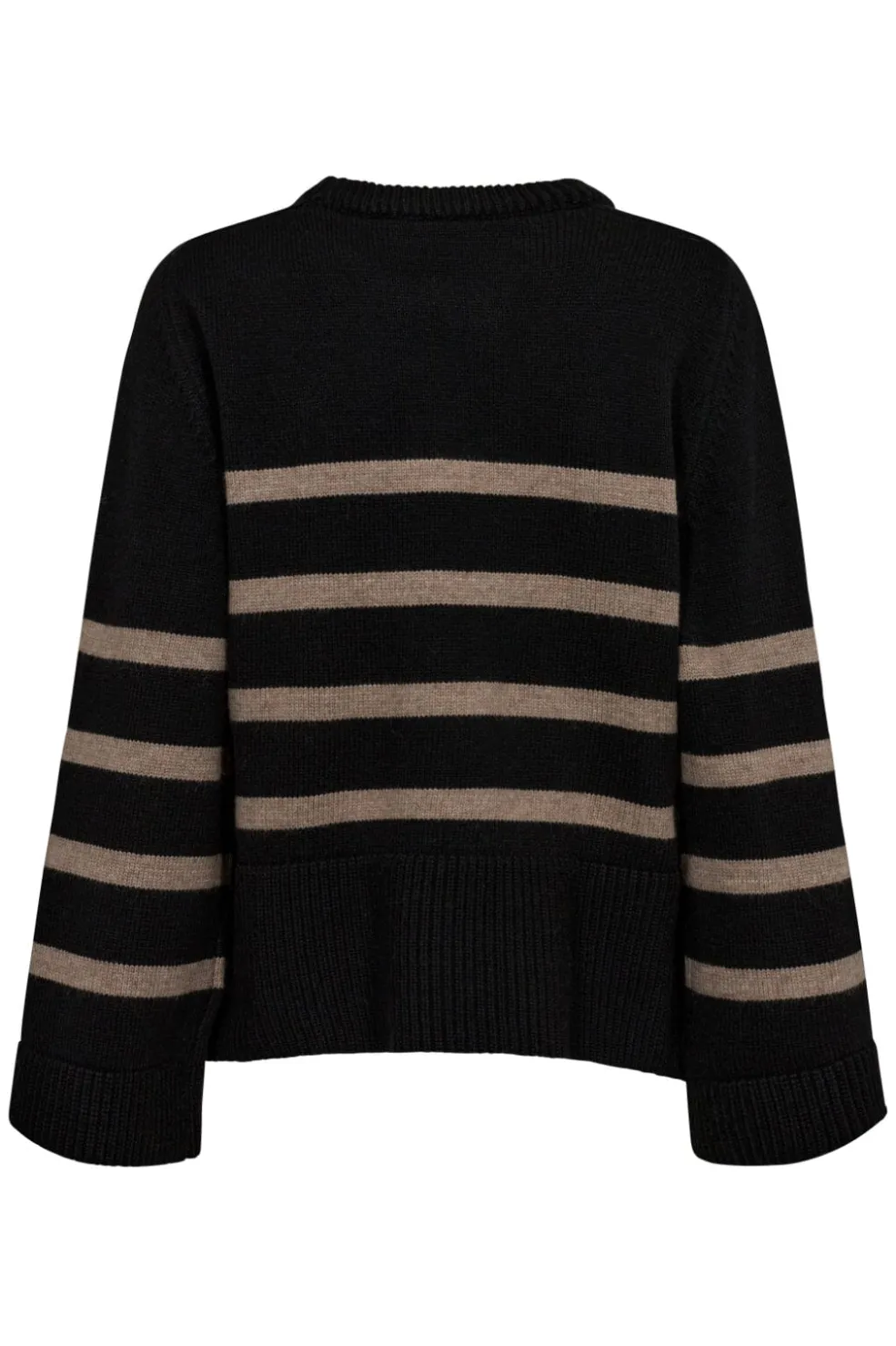 Sort strikbluse med lyse vandrette striber. Den har rund halsudskæring og lange ærmer med ribkant. Guldknapperne på siden giver et særligt præg.