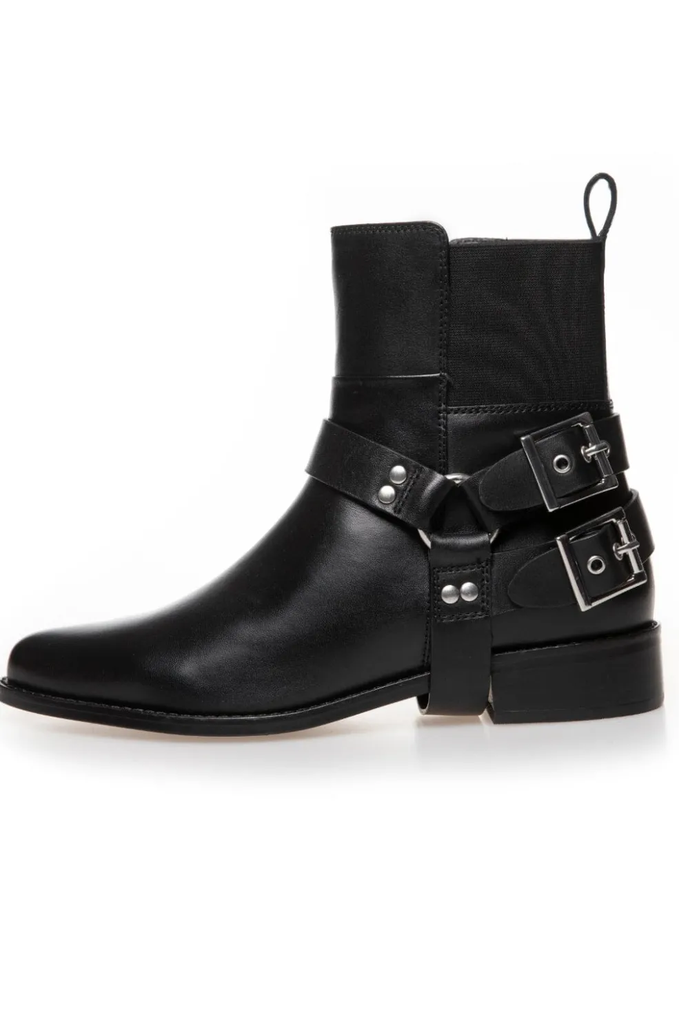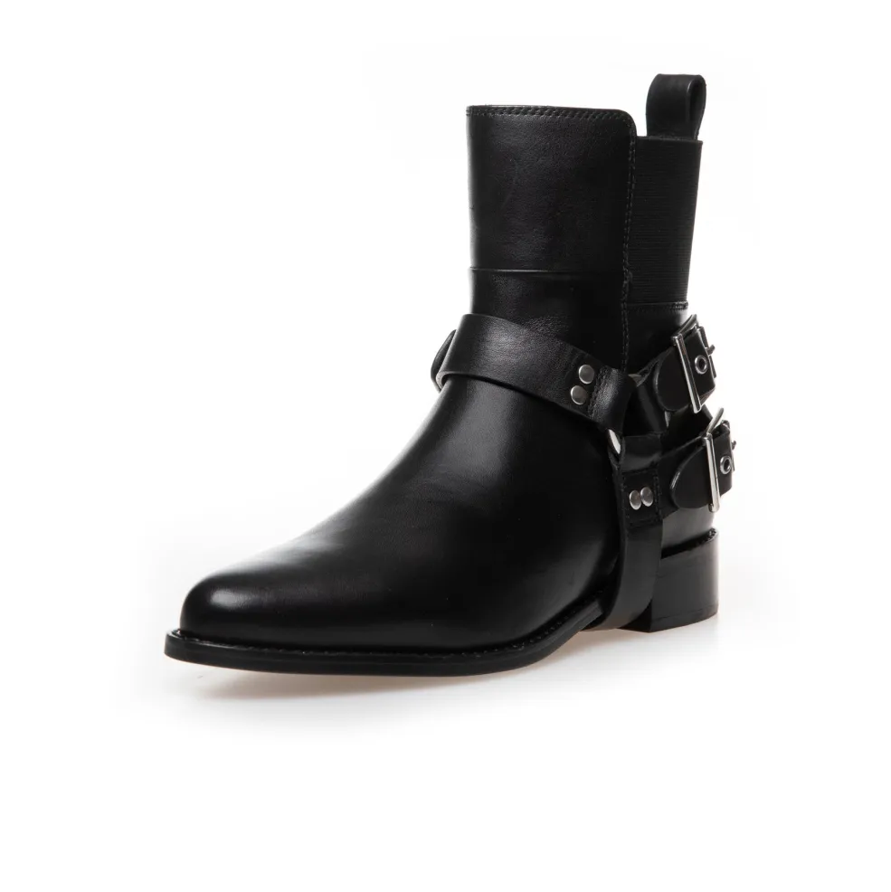 Sort ankelstøvle i læder med to spænder på siden. Støvlen har en spids tå og en lav blokhæl, der giver god støtte ved gang.