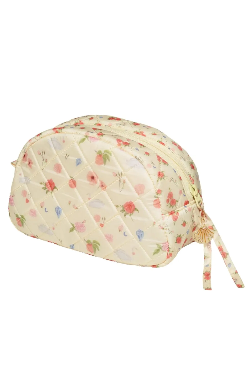 Quiltet makeuptaske fra Maanesten med blomster- og skalmønster på lys baggrund. Tasken har en praktisk størrelse til både hverdagsbrug og når du skal ud.