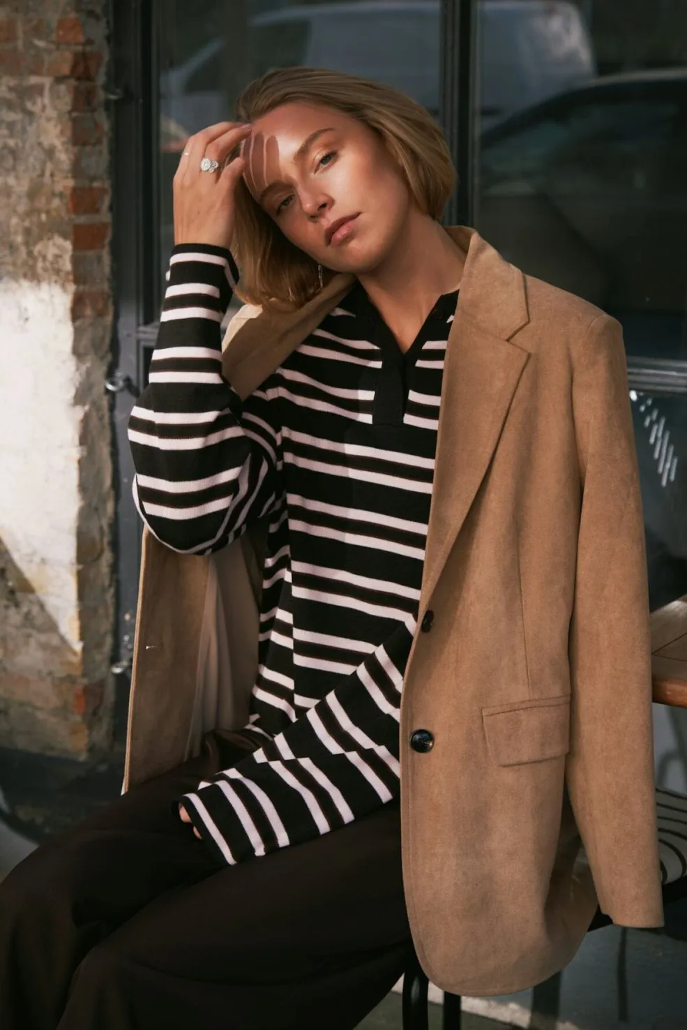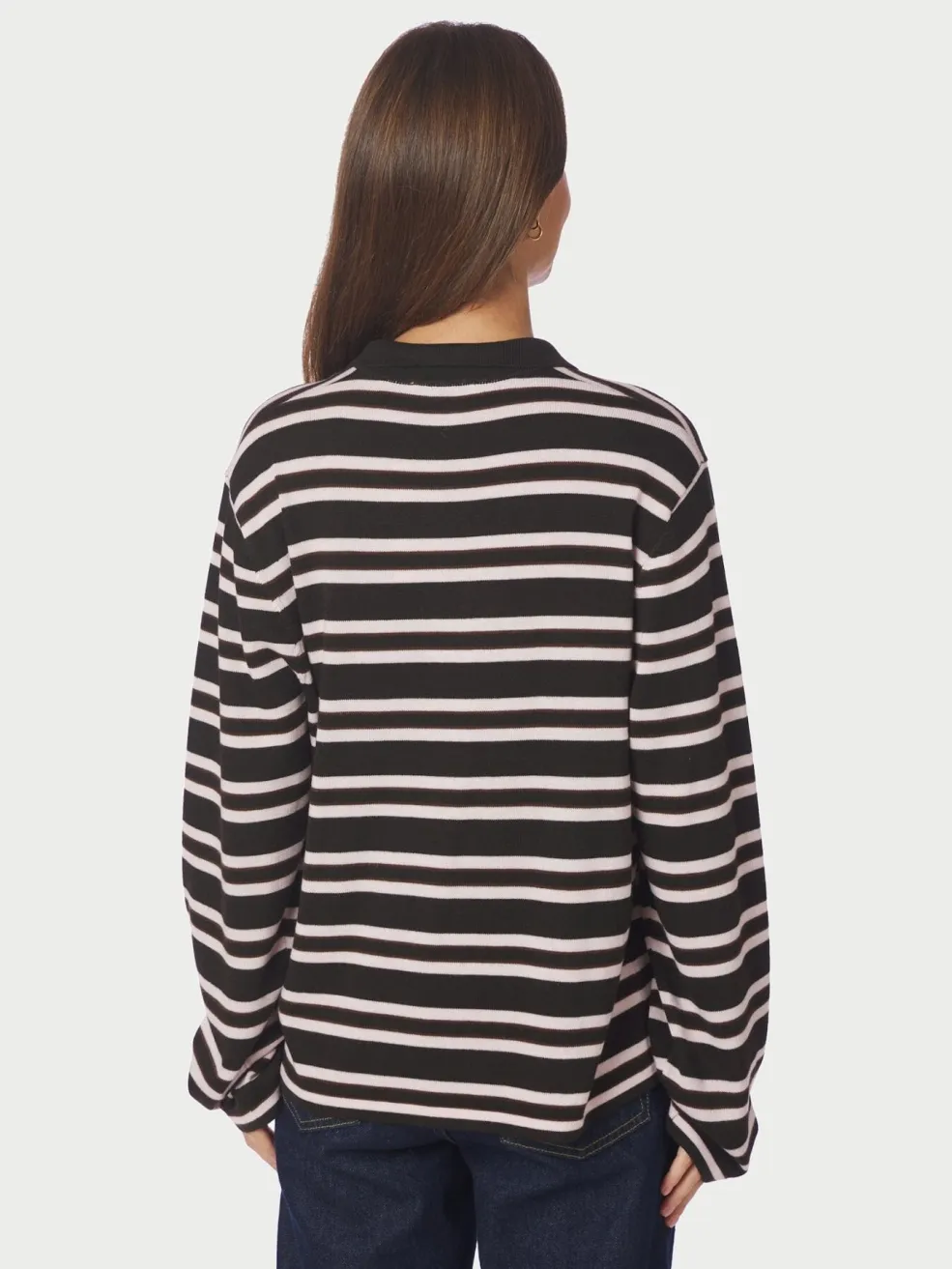 Mørkebrun strikbluse fra Neo Noir med vandrette striber i hvid. Blusen har en polo-krave med knaplukning og lange ærmer.