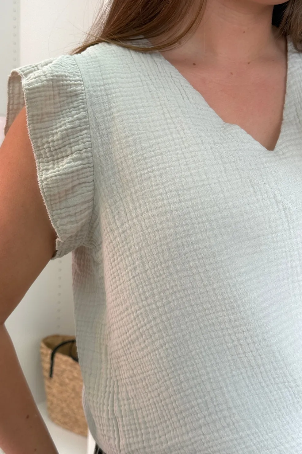 Beige top fra A-bee med V-hals og flæseærmer. Toppen har en struktureret overflade i bomuldsstof, der giver den karakter. Den beige farve er neutral og nem at style.