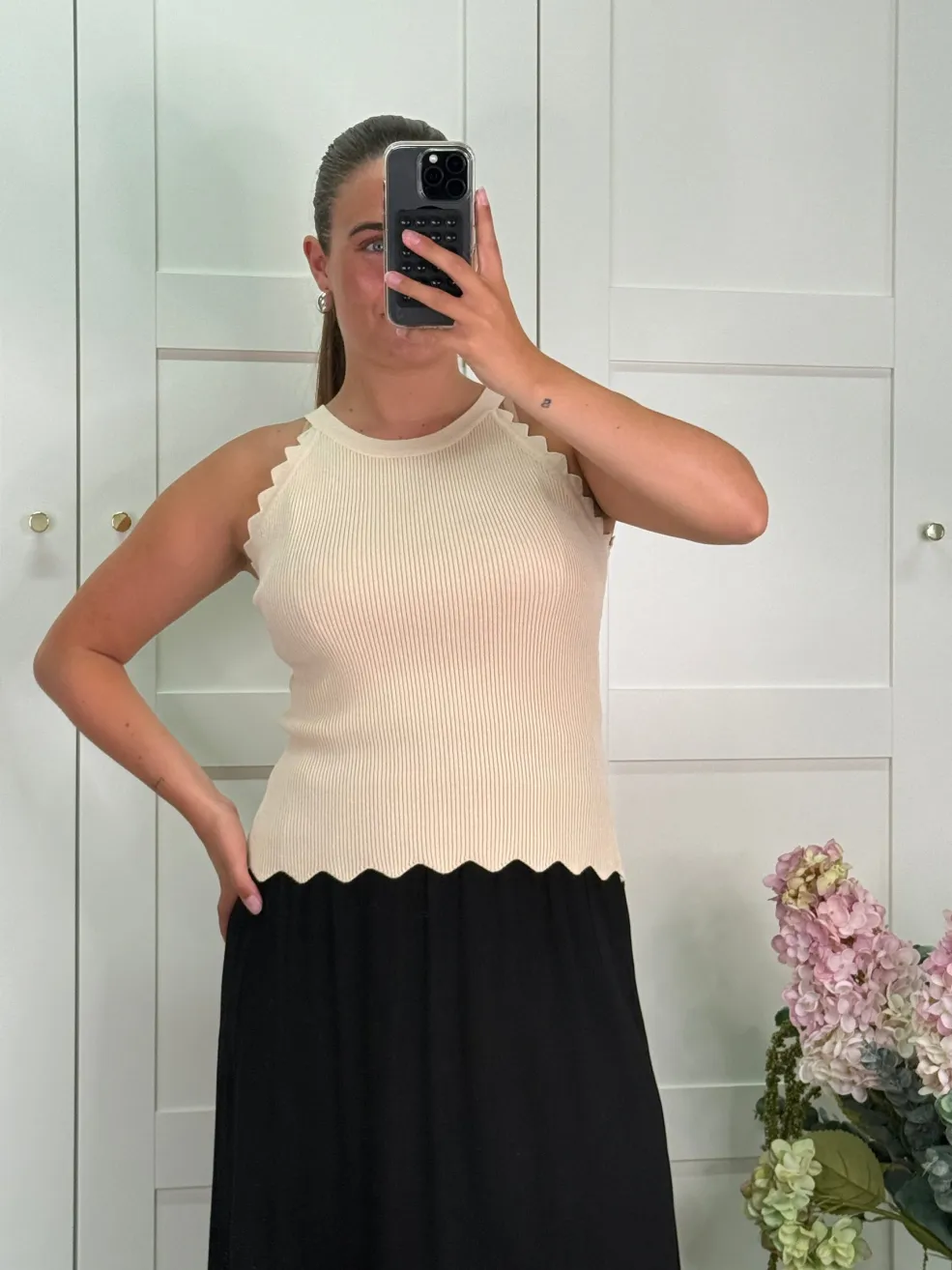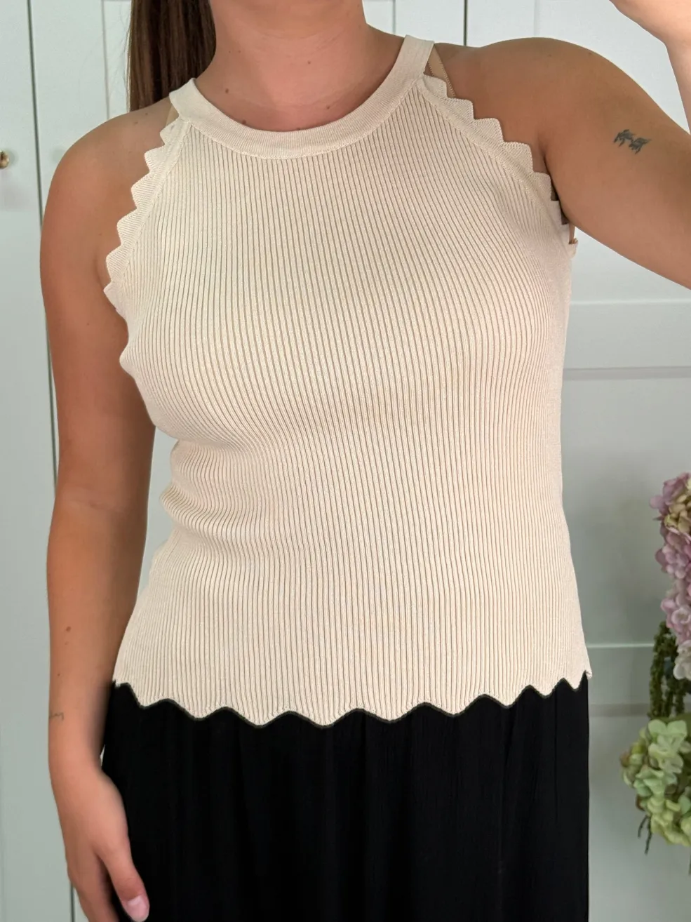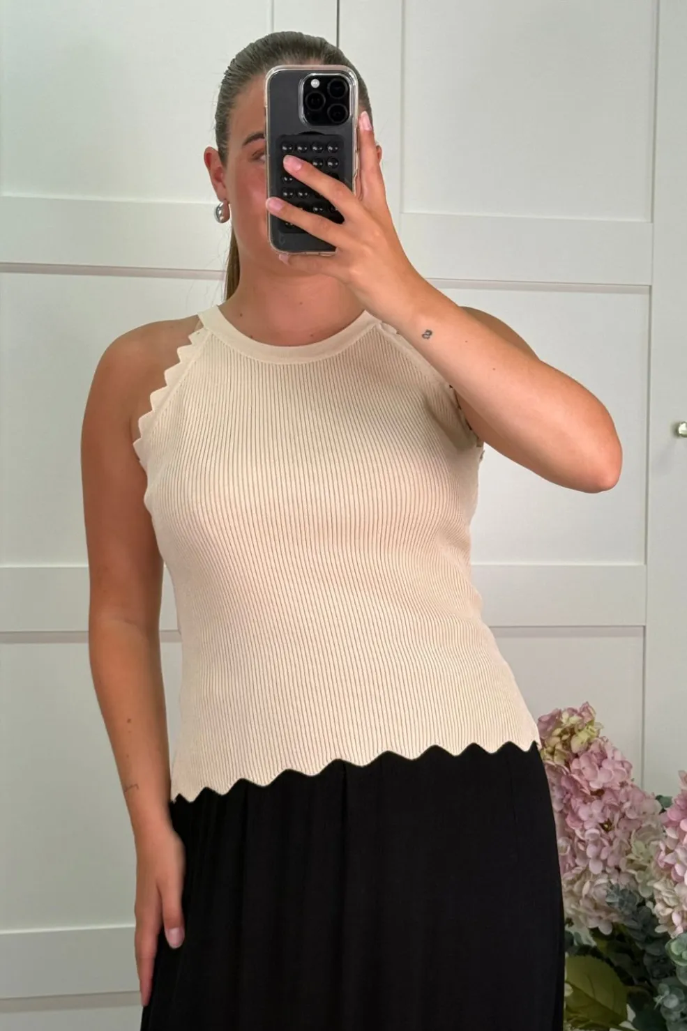 Beige ærmeløs top fra A-bee med ribbet tekstur og bølgede kanter. Toppen har en rund halsudskæring og en slim fit.